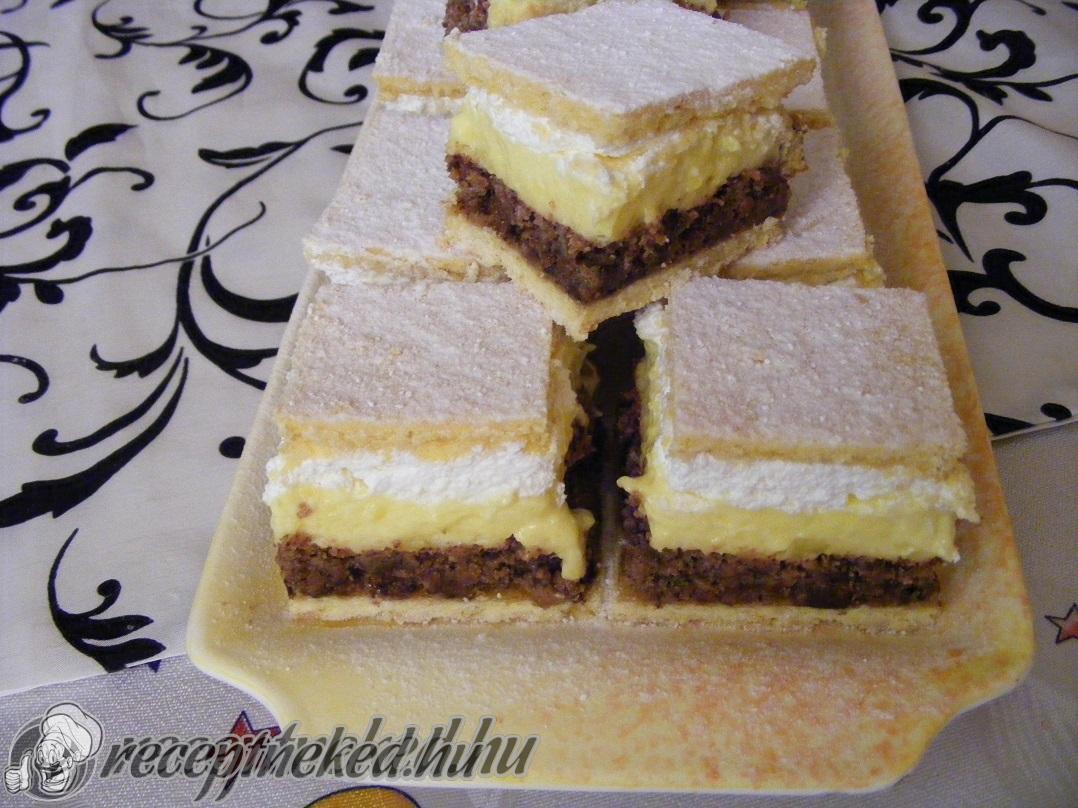 Amíg a tészta sül elkészítjük a vaníliás krémet. Ehhez a pudingporokat cukorral és vaníliás cukorral tejben megfőzzük, majd kihűtjük. A tejszínből habot verünk, megfelezzük és a felét belekeverjük a pudingba. Ha kisült a tészta kihűtjük, majd megkenjük a pudinggal. A puding tetejére tesszük a maradék tejszínhabot és az először megsütött tésztalapot.