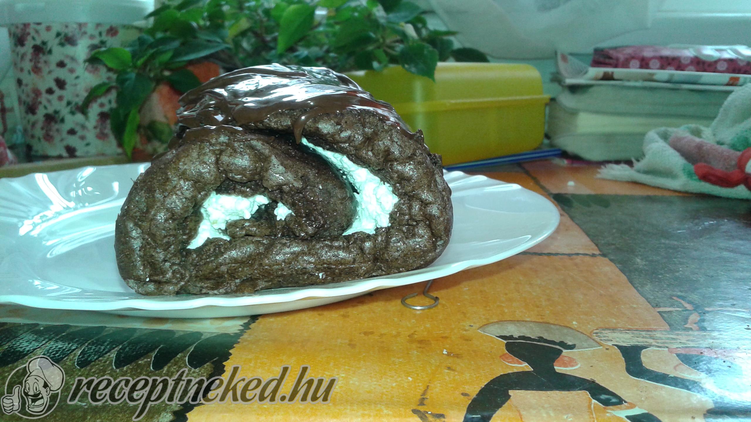 Ha megsült, várjunk egy keveset, majd még melegen tekerjük fel úgy, hogy lehúzzuk róla a sütőpapírt.