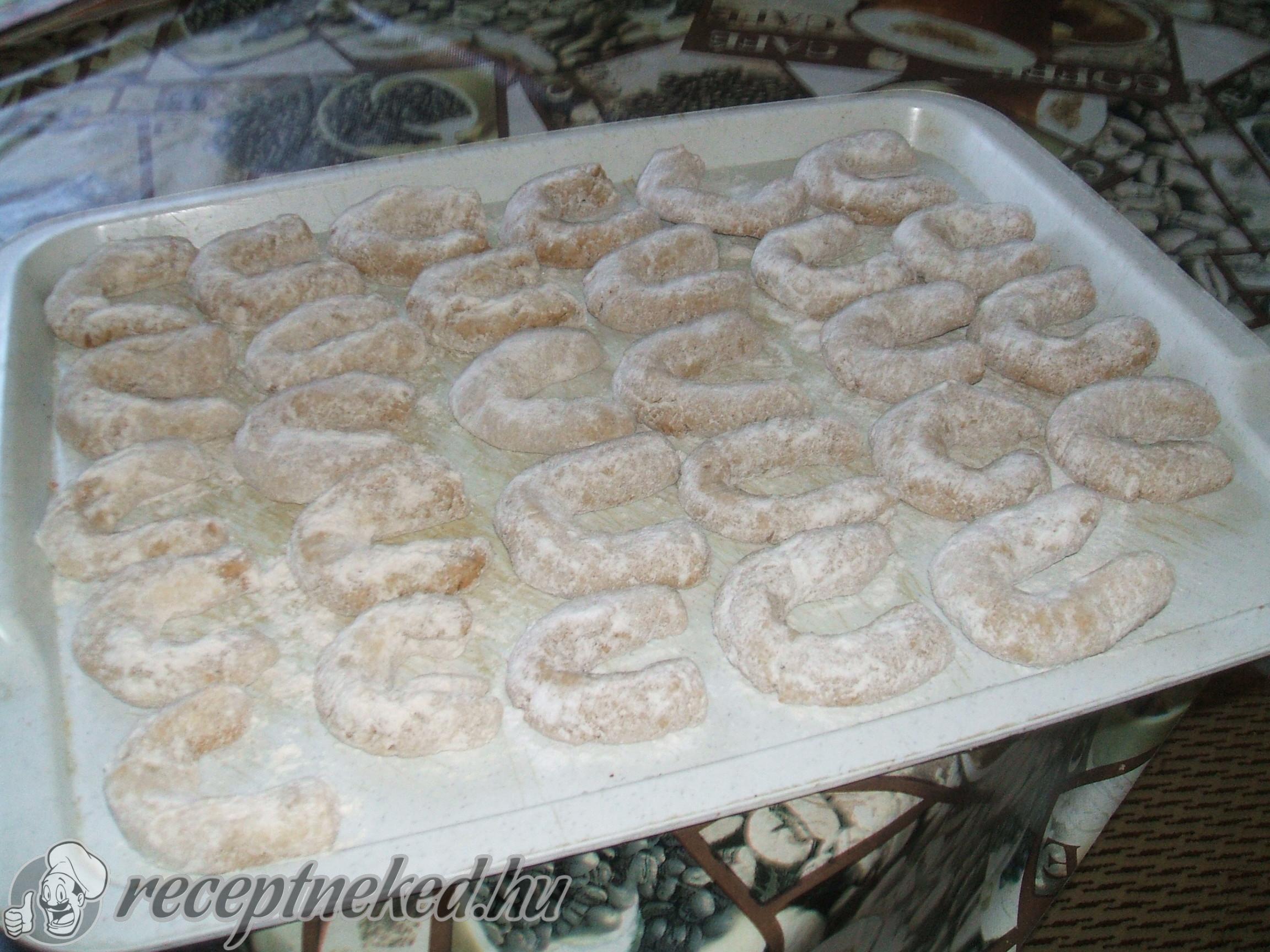Az egyik tésztát kivesszük a hűtőből és kb ujjnyi vastag rúddá sodorjuk. A rudat kb 5 cm-es darabokra vágjuk, kifli formára hajlítjuk és formázzuk, majd tepsire sorakoztatjuk.