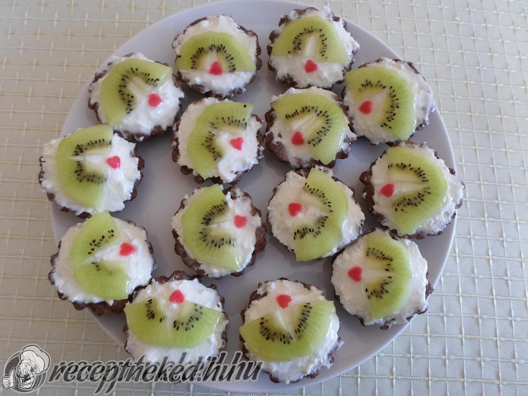 A kiviket meghámozzuk, felszeleteljük, és a szeleteket is kettévágjuk, majd mindegyik krémmel megtöltött kosárra teszünk egy-egy szeletet. A tortazselét a csomagoláson lévő utasítás szerint elkészítjük, és ecsettel átkenjük a gyümölcsöt.