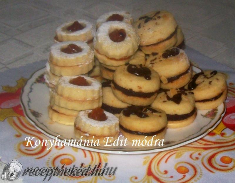 Ha kihűltek a tésztakorongok, akkor a teli korongokat 1-1 kiskanálnyi lekvárral megkenjük és egy lyukasat ráillesztünk, majd porcukorral megszórjuk.