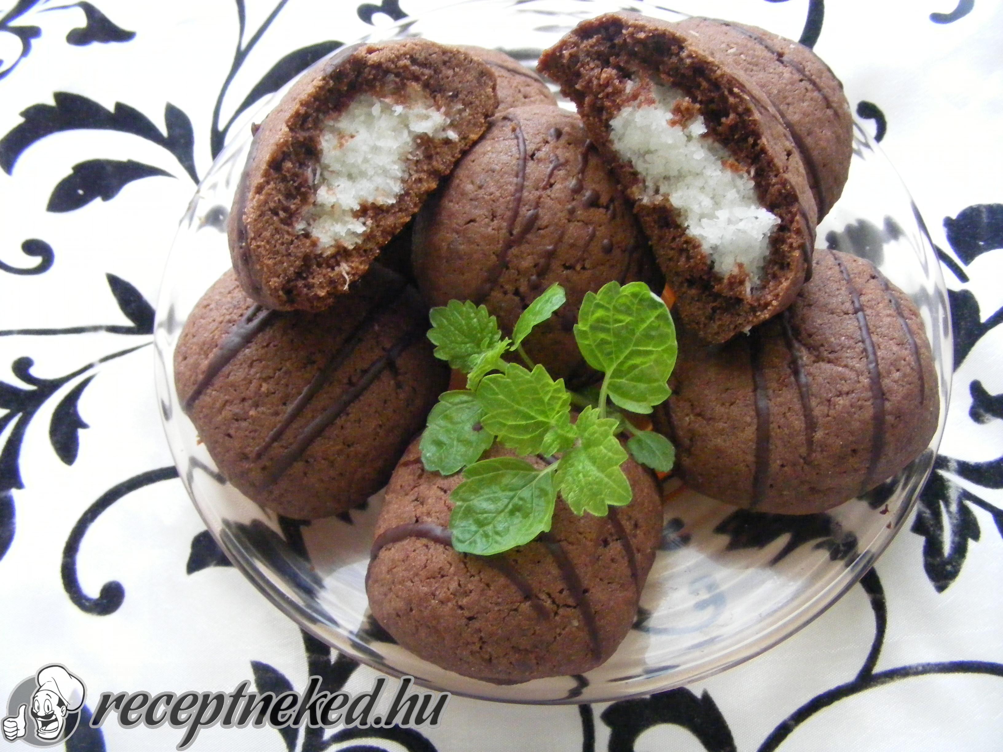 A barna tésztából is kis gombócokat készítünk, majd kilapítjuk és rátesszük a kókuszos golyókat. A fehér golyókat bevonjuk a tésztával, majd sütőpapíros sütőlapra tesszük, egy kicsit távolabb egymástól.