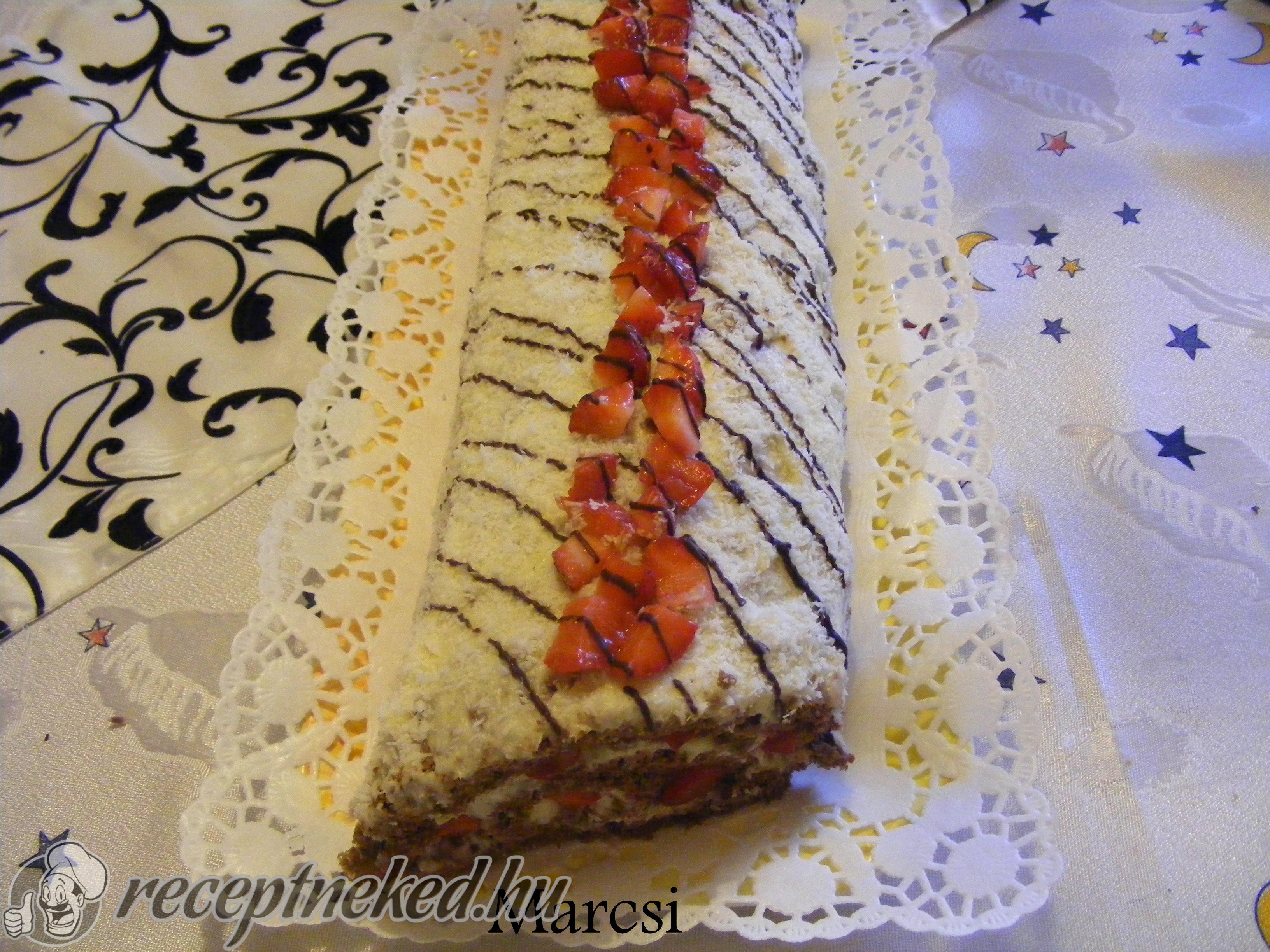A piskótát kitekerjük, megtöltjük a krémmel, feltekerjük és a külsejét is bekenjük. Kevés eperrel meghintjük, majd olvasztott csokit csorgatunk rá.