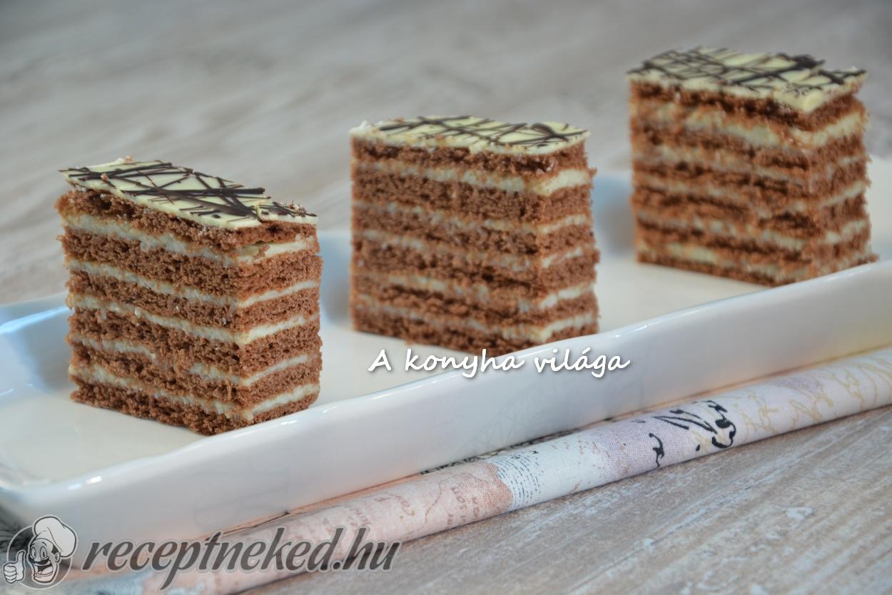 Nem forró, de még nem is langyos állapotban belekeverjük a vajat. Mikor a krém már kihűlt, egymásra rétegezzük a lapokkal.