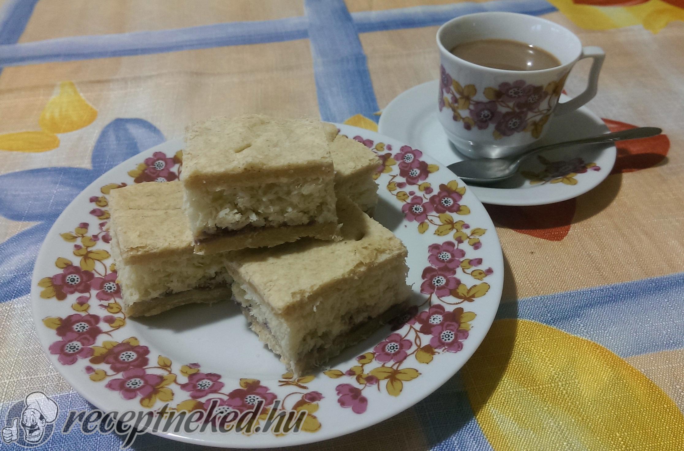 A félretett kókuszreszeléket fél evőkanálnyi cukorral összedaráljuk és a még meleg sütire szitáljuk.