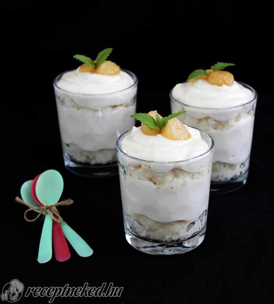 A teljesen kihűlt tejbegrízt és a mascarponés körtekrémet felváltva kanalazzuk a poharakba, majd díszítsük a félretett körtedarabokkal és citromfűvel.