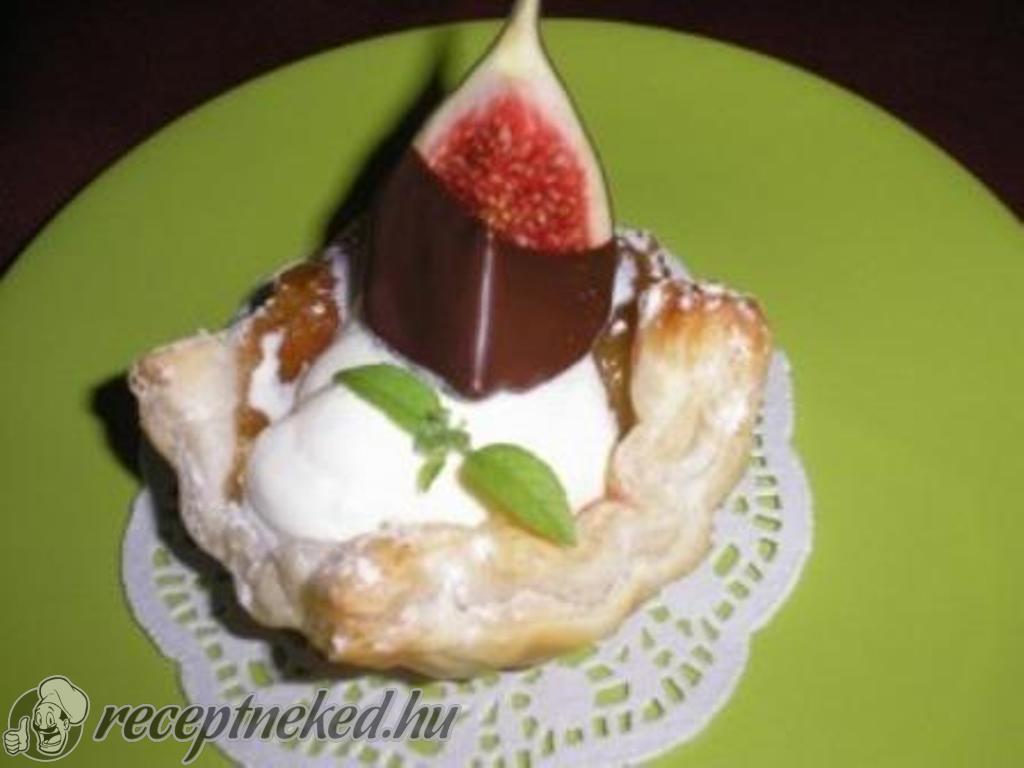 A tejszínt felverjük a cukorral, majd a kosarakba elosztjuk. A csokis fügével díszítjük, végül porcukorral beszórjuk.