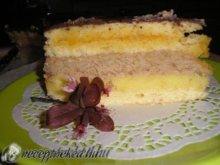 A tészta hozzávalóiból a szokásos módon piskótatésztát keverünk, majd egy 25*35 cm-es, sütőpapíros tepsibe simítjuk, majd előmelegített sütőben tűpróbáig sütjük. Ha kihűlt három hosszúkás lapra vágjuk, úgy hogy a lapok beleférjenek egy 23*12 cm-es sütőformába.