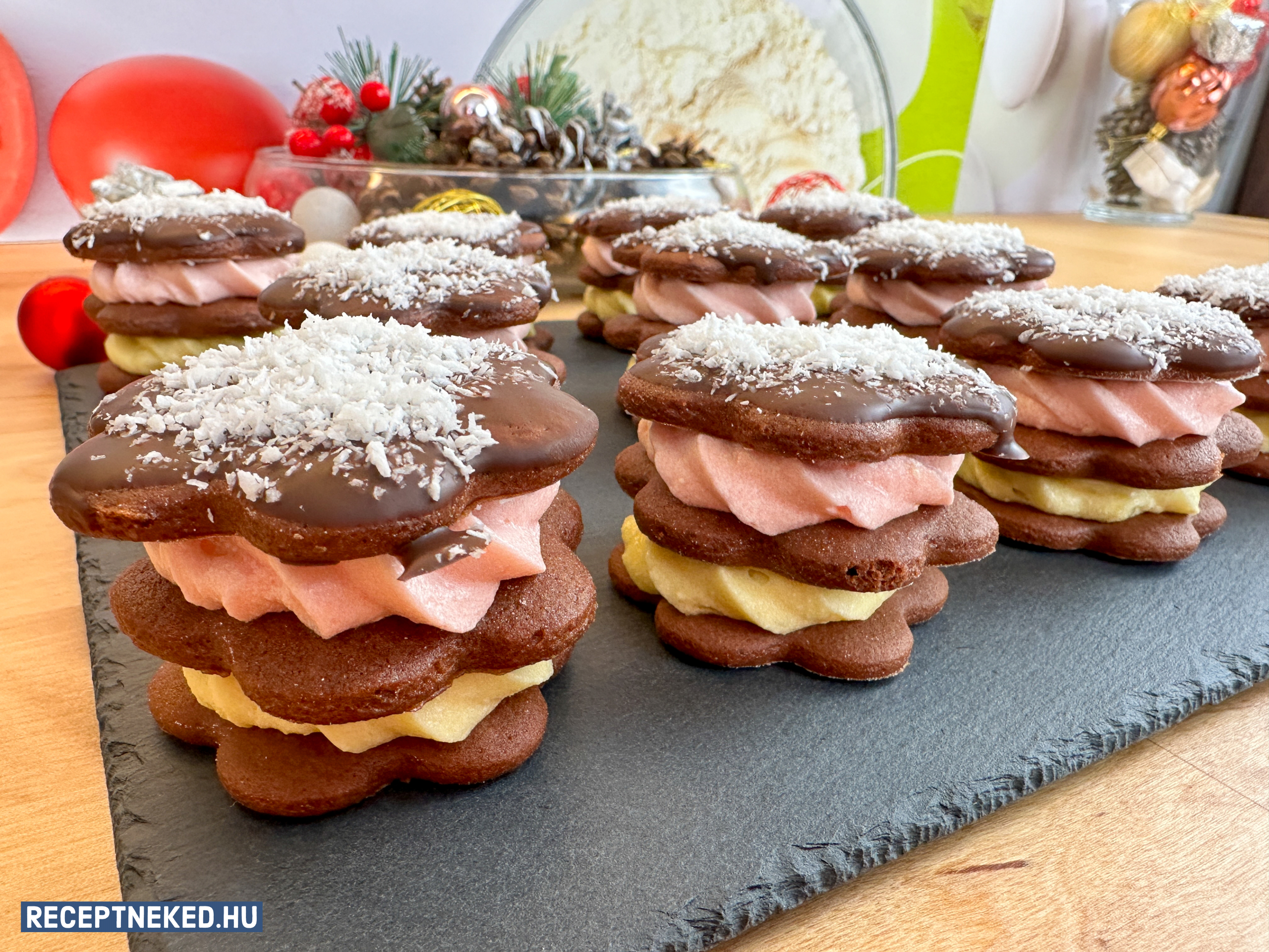 Az alsó kekszre nyomunk az egyik krémből. Ráteszünk egy másik kekszet és kissé rányomjuk, majd arra a másik krémből nyomunk és arra a csoki bevonatos kekszet tesszük, amit szintén kissé rányomunk a krémre.