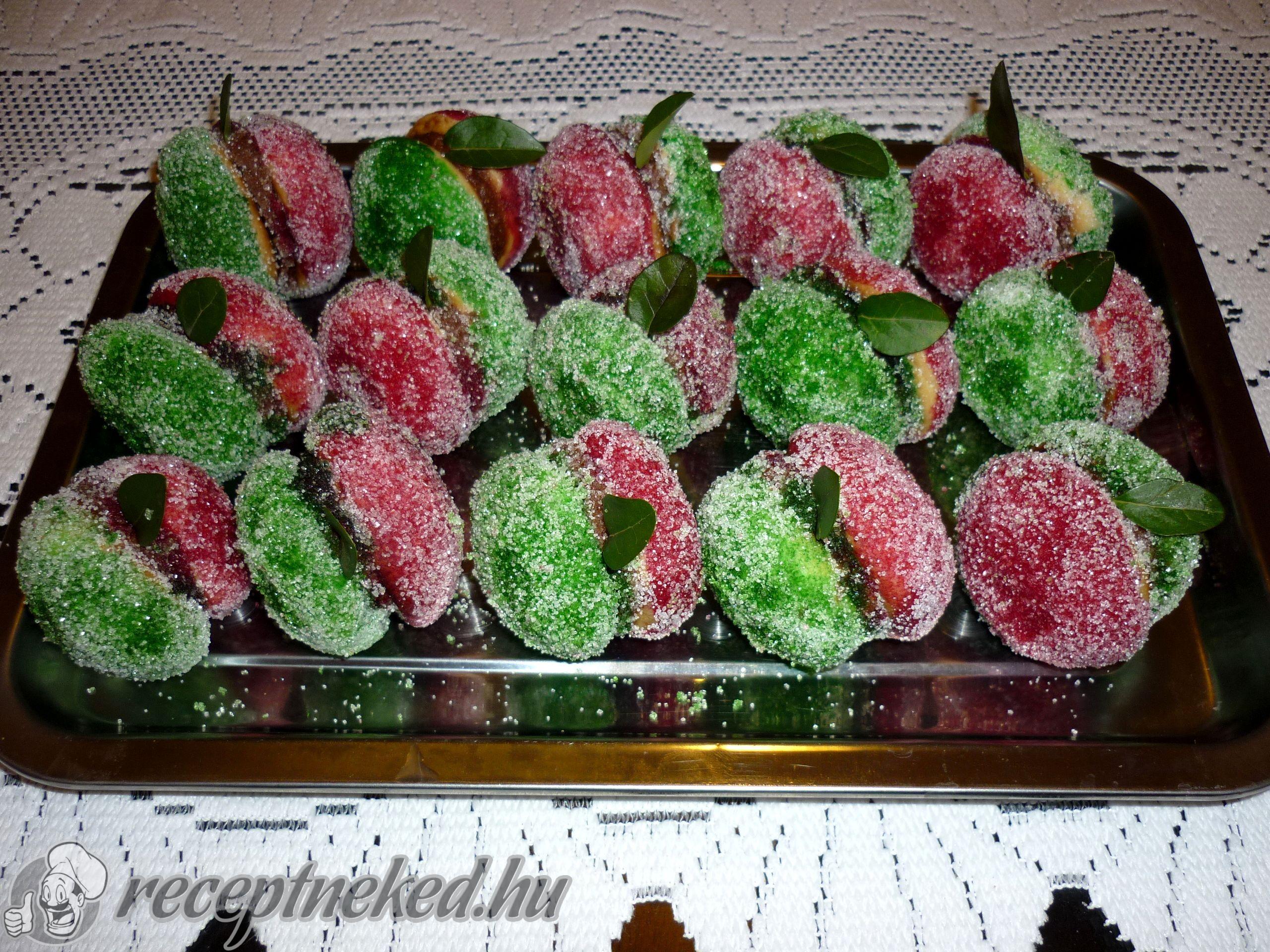 Hagyjuk lecsepegni a felesleges vizet, majd forgassuk meg a cukorban és sorakoztassuk zöldes felükkel felfelé egy tálcára.
