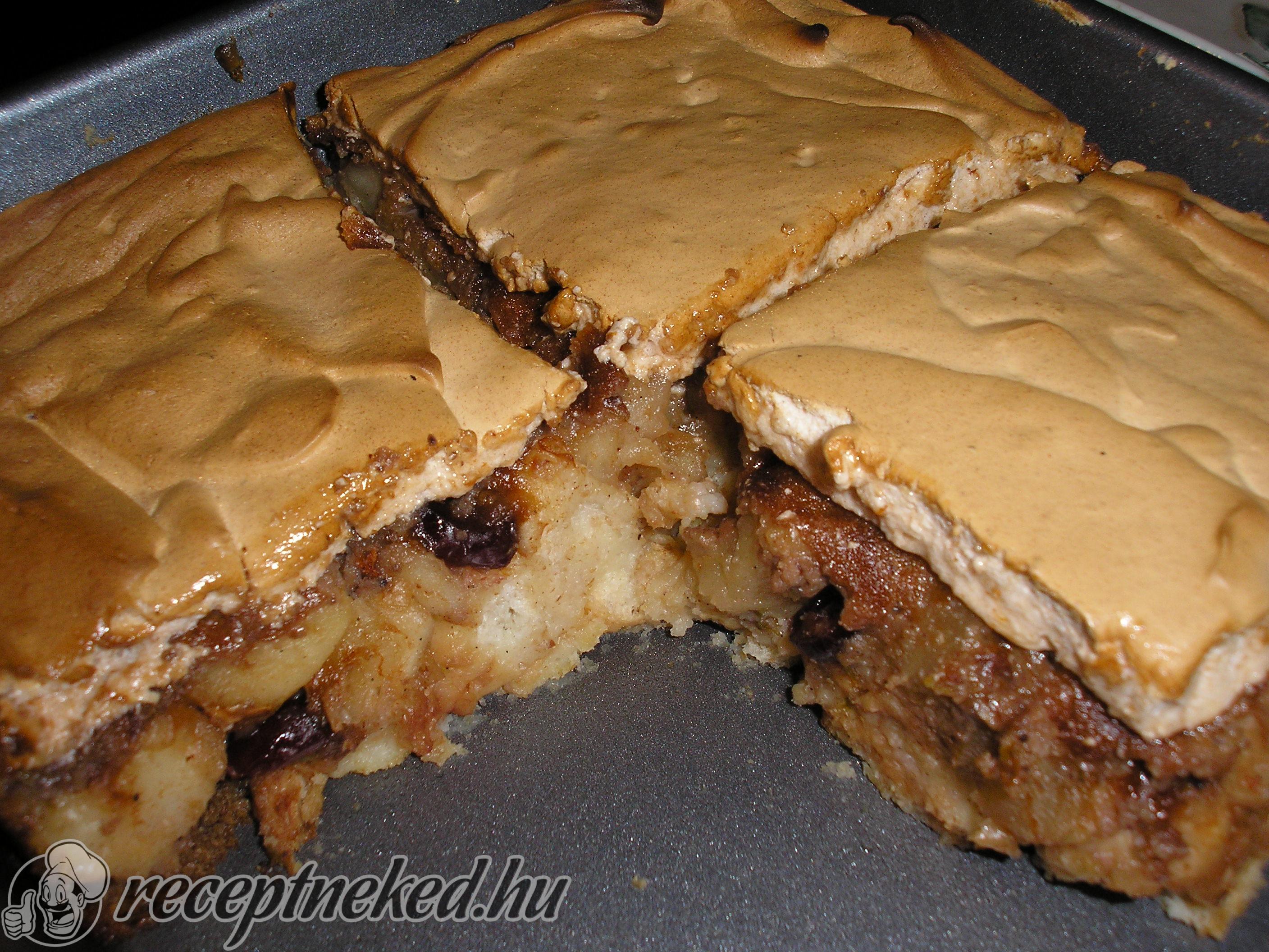 Kivesszük a tepsit a sütőből és rákenjük óvatosan a habot. Visszatoljuk a sütőbe és 140 fokon szárítjuk, míg szépen megsül a hab a tetején. Halványbarnának kell lennie.