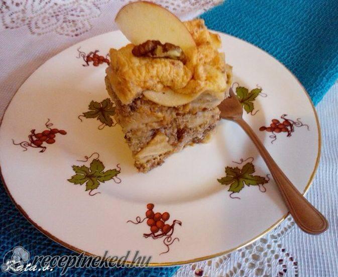Egy jénai tálat vagy tepsit kivajazunk és zsírozunk és belerétegezzük a hozzávalókat. Először a kifli 1/3-adát tesszük a tál aljára, rá a mazsola fele, majd a dió fele, erre jön a lekvár, amiből kb 2-3 evőkanállal csorgatunk a dió tetejére. Ezt a műveletet újból megismételjük, rá jön a maradék kifli, majd a szeletelt almát szépen elhelyezzük a tetején.