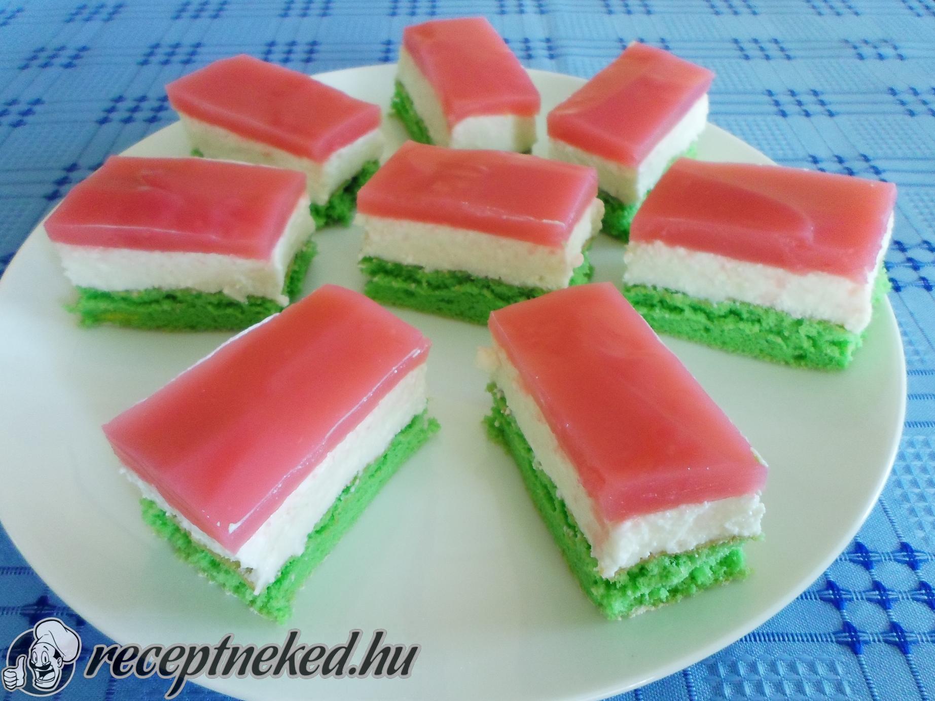 A zselét ezután a hab tetejére simítjuk. A süteményt ezután hűtőbe tesszük 2 órára. Amikor a zselé megdermedt, akkor szeletelhető.