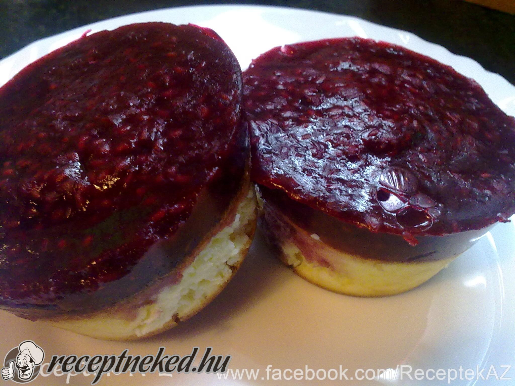 A kész muffinokat (12 db) a formában hagyjuk kihűlni. A fagyasztott málnát a vízzel, egy kevés édesítőszerrel és a tortazselével megfőzzük, majd a kihűlt muffinokra kanalazzuk és megvárjuk míg a zselé megköt.