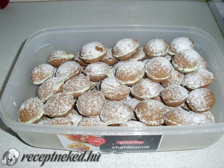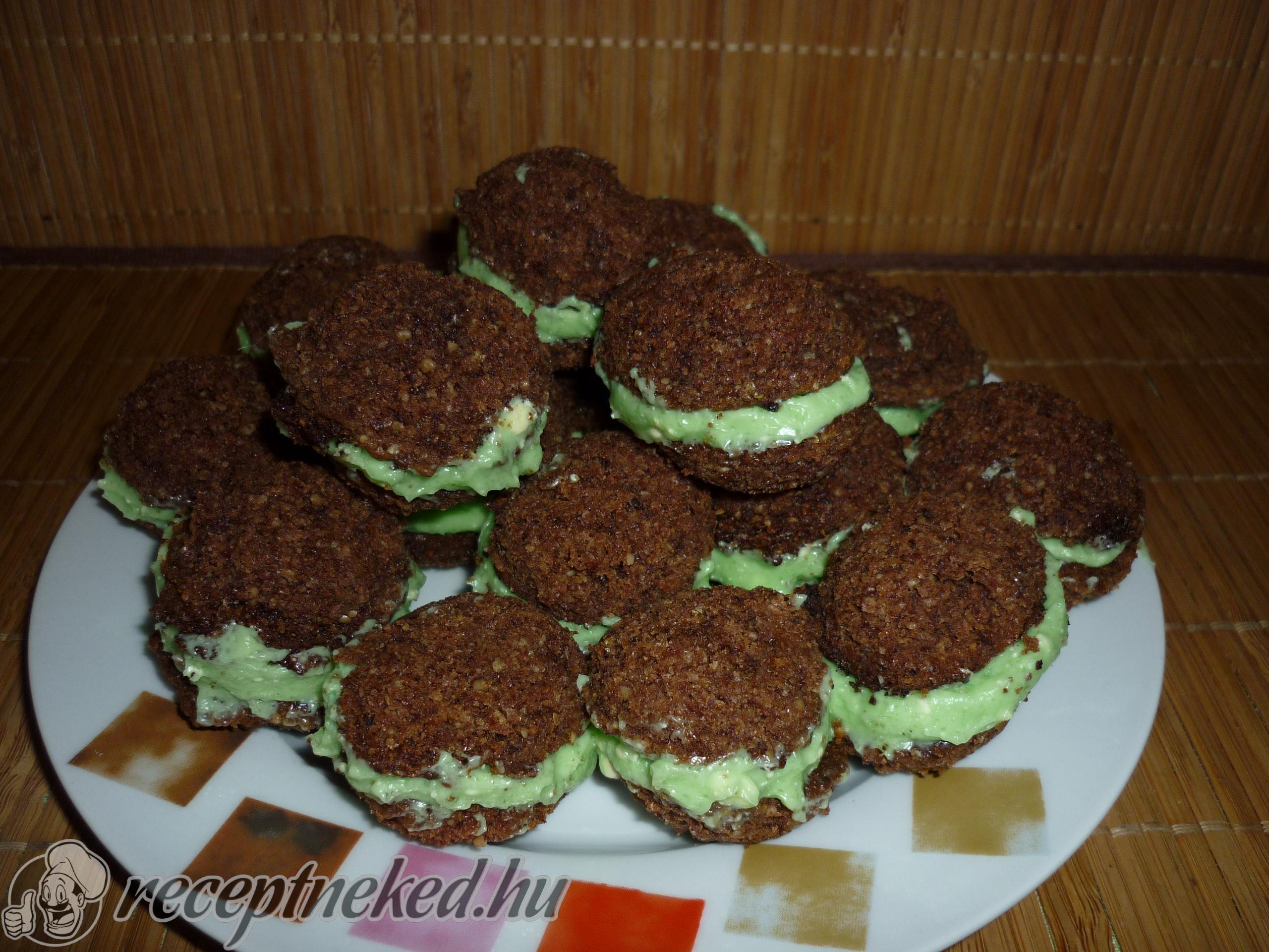 Kétfelé osztjuk a krémet és megtöltjük vele a lapokat.