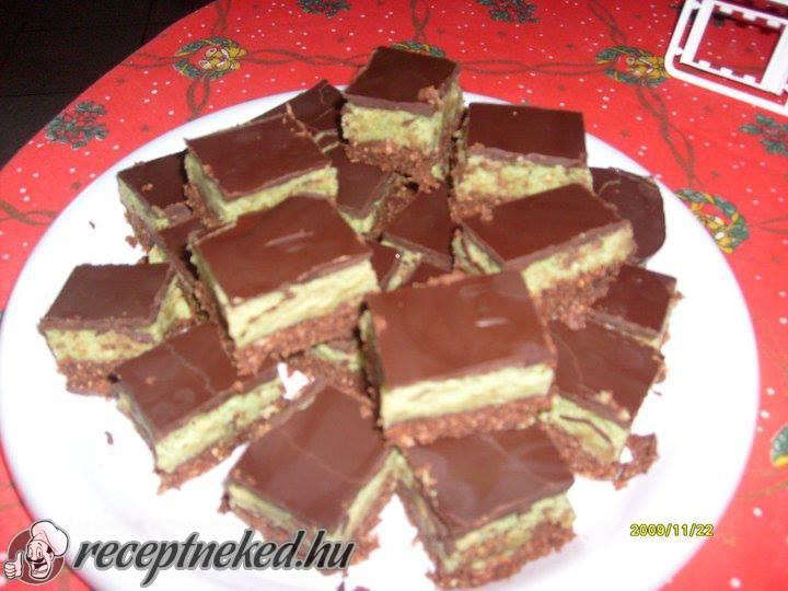 A tetejére a fehér csokoládét olajjal felolvasztjuk, ráöntjük az utolsó lap tetejére és egyenletesen elkenjük.