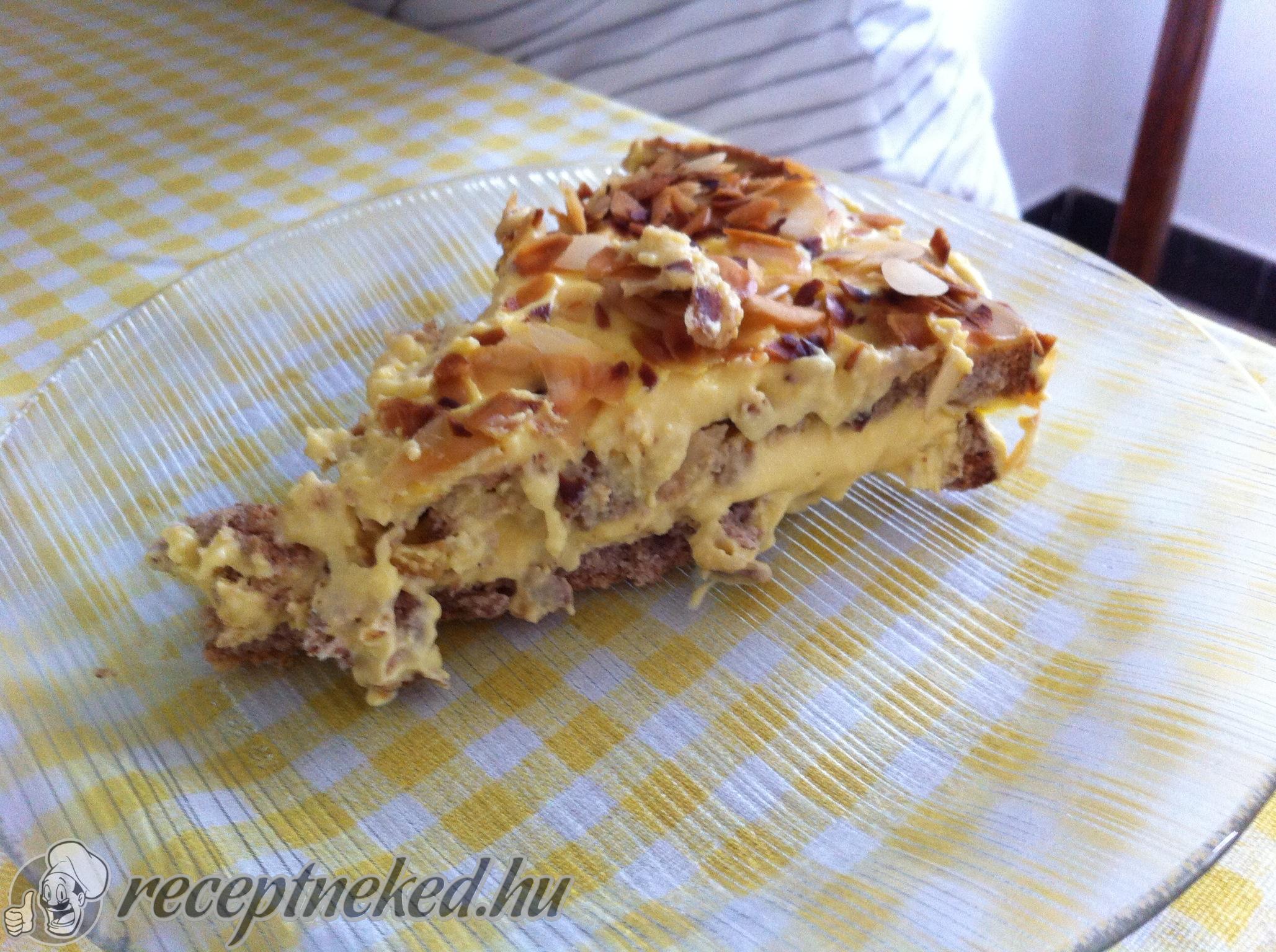 A szeletelt mandulát száraz serpenyőben aranyszínűre pirítjuk, majd a torta tetejére szórjuk. Legalább egy éjszakán át hűtőben pihentetjük, hogy az ízek összeérjenek.