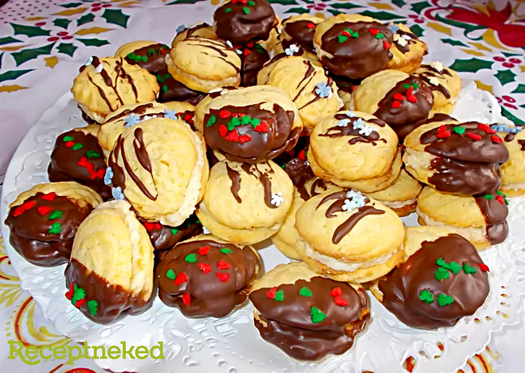 A csokit feolvasztjuk, majd az összeragasztott korongok egyik felét belemártjuk. Amíg megdermed rácsra vagy sütőpapírra tesszük. Száradás előtt díszítőcukrokat szórhatunk rá.