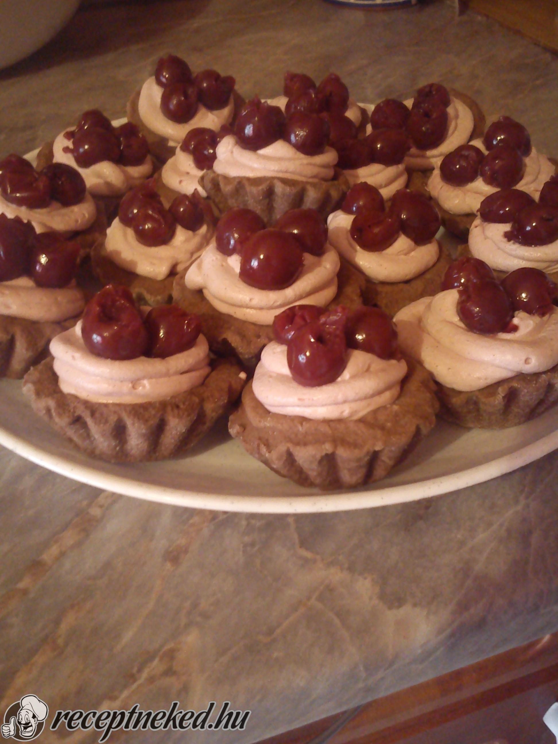 A kész krémet habzsákkal vagy kisnanállal a kosárkákba töltjük, majd 2-3 szem meggyet nyomkodunk bele.