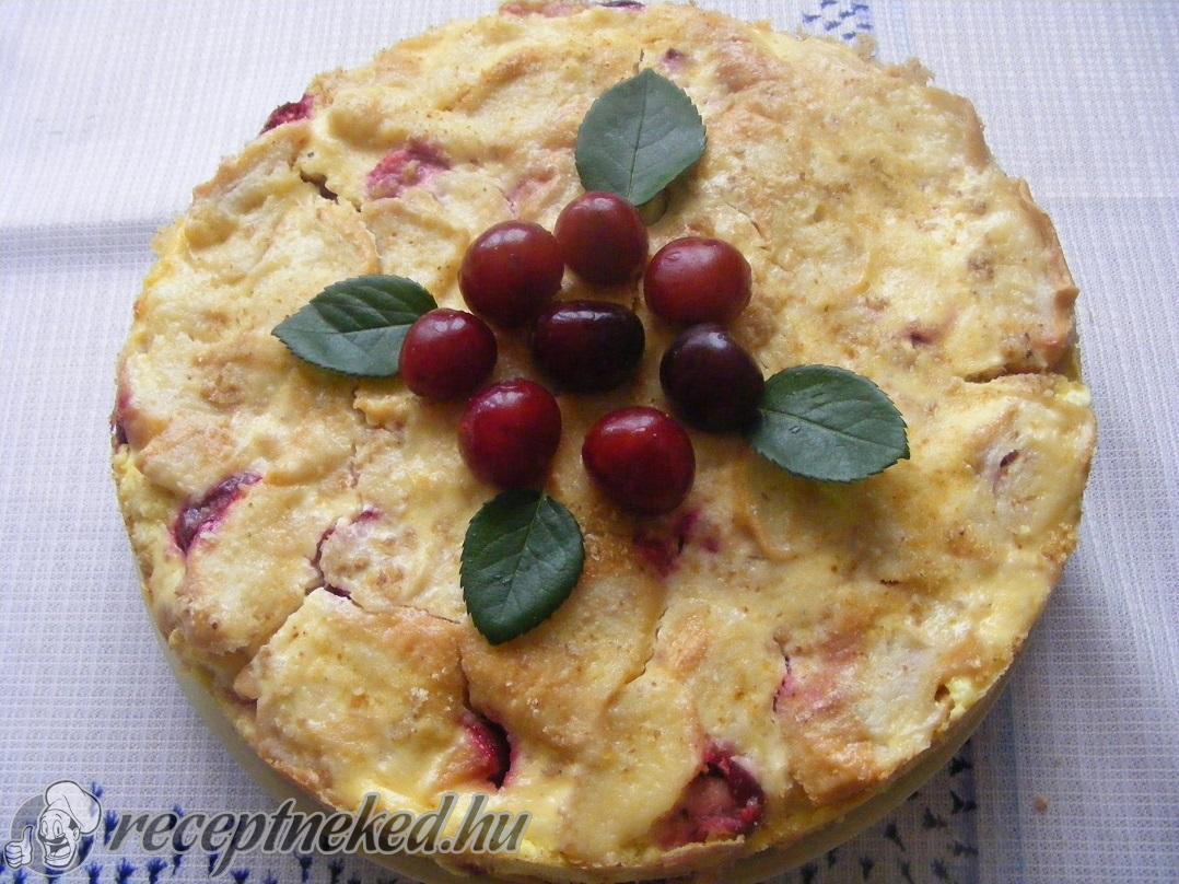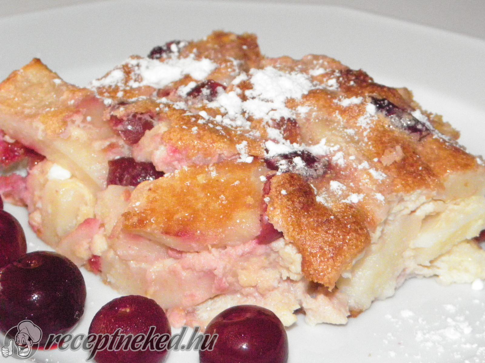 A felszeletelt kalácsot vágjuk fel ízlés szerinti kockákra, majd a felét terítsük bele az előzőleg kivajazott sütőformába. Ezután szórjuk meg az alaposan lecsepegtetett meggybefőttel, majd fedjük be a maradék, felszeletelt kaláccsal.
