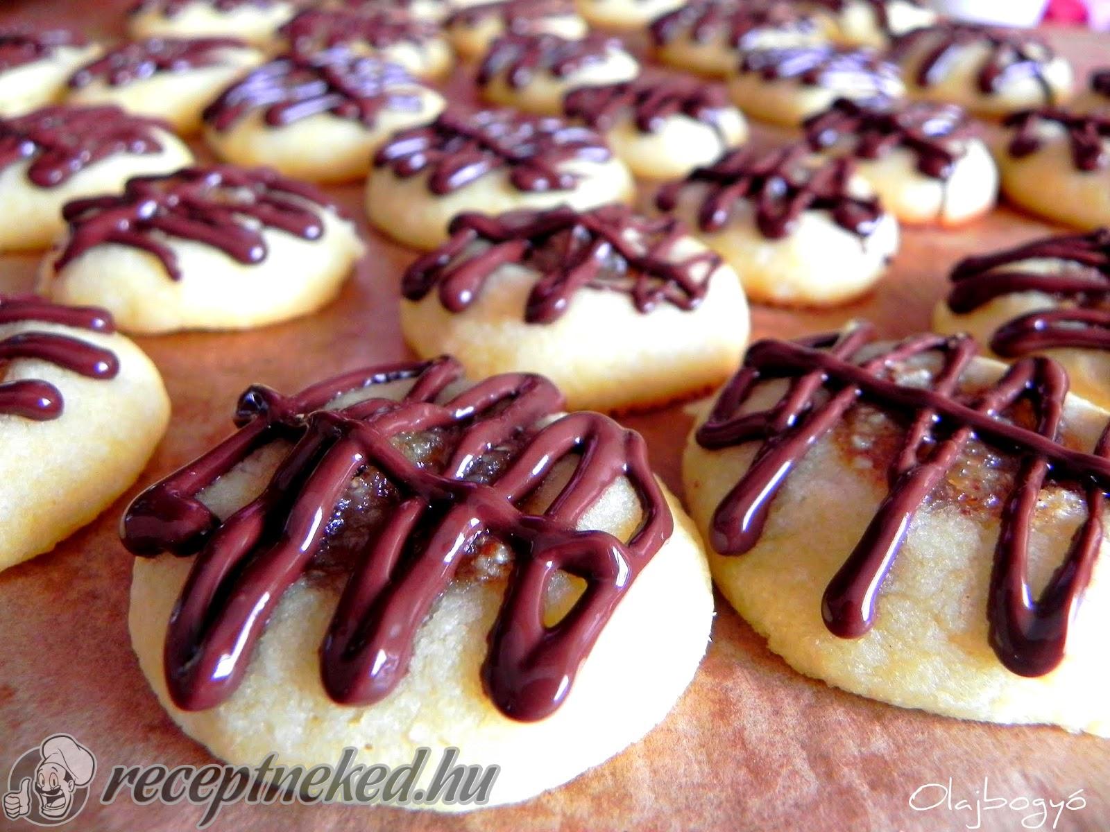 A csokoládét az étolajjal víz felett felolvasztjuk, majd a kihűlt sütemények tetejét becsíkozzuk vele.