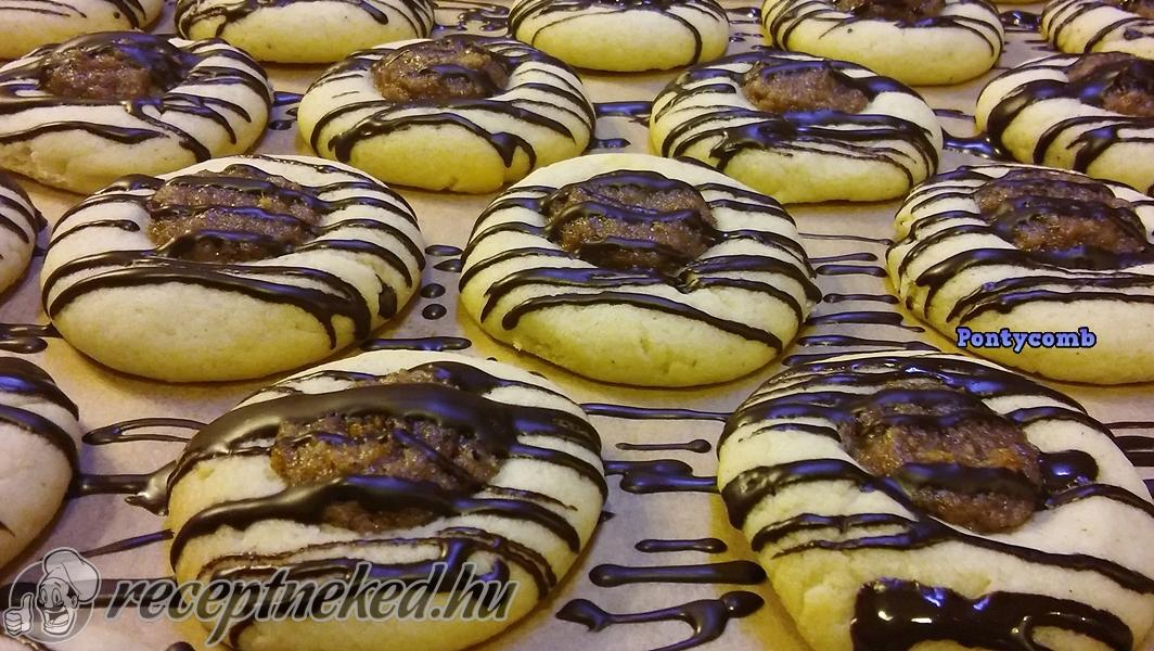 Helyezzük az előkészített sütőlapra egymástól kicsit távolabb, mert sütés közben elterülnek. A lyukakat megtöltjük a diós töltelékkel (kb 1 csapott kávéskanálnyi jut minden egyes sütibe).