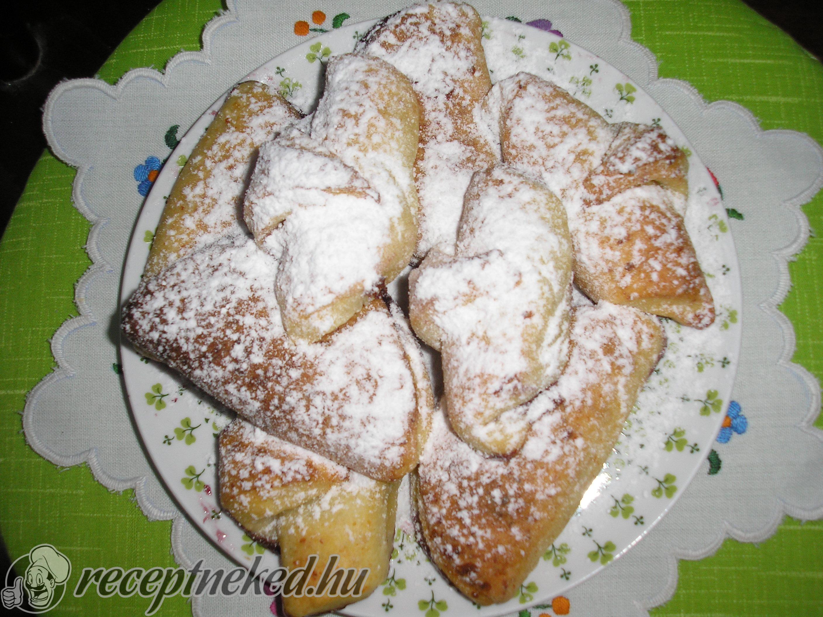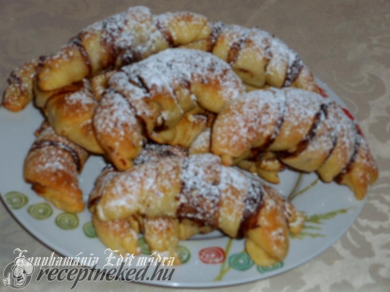 Ezt ráhelyezzük a mogyorókrémmel megkent tésztára, nyújtófával még egy kissé megnyújtjuk vagyis lenyomatjuk és 12 cikkekre vágjuk. A szeletek vastagabb végére teszünk egy kiskanál mogyorókrémet, majd innen kezdve feltekerjük. A megformázott kifliket sütőpapíros tepsibe sorakoztatjuk.