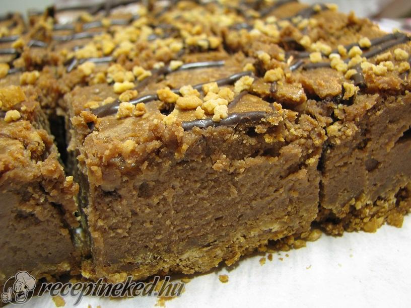 A csokoládét mikróban olvasszuk fel és csorgassuk a langyosra hűlt süti tetejére, ezután szórjuk meg a mogyoróval. Én egy éjszakát szoktam a hűtőben pihentetni, hogy az ízek jobban összeérjenek és könnyebben szeletelhető legyen.