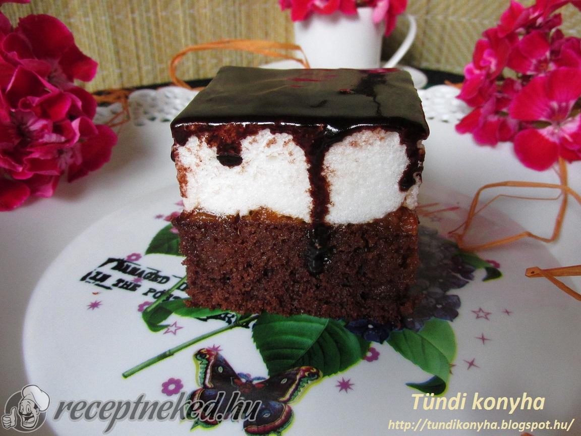 Elkészítjük utána a mázat: a margarint a porcukorral és a kakaóporral összeolvasztjuk (alacsony hőfokon) és még melegen a kemény habra öntjük és elsimítjuk.