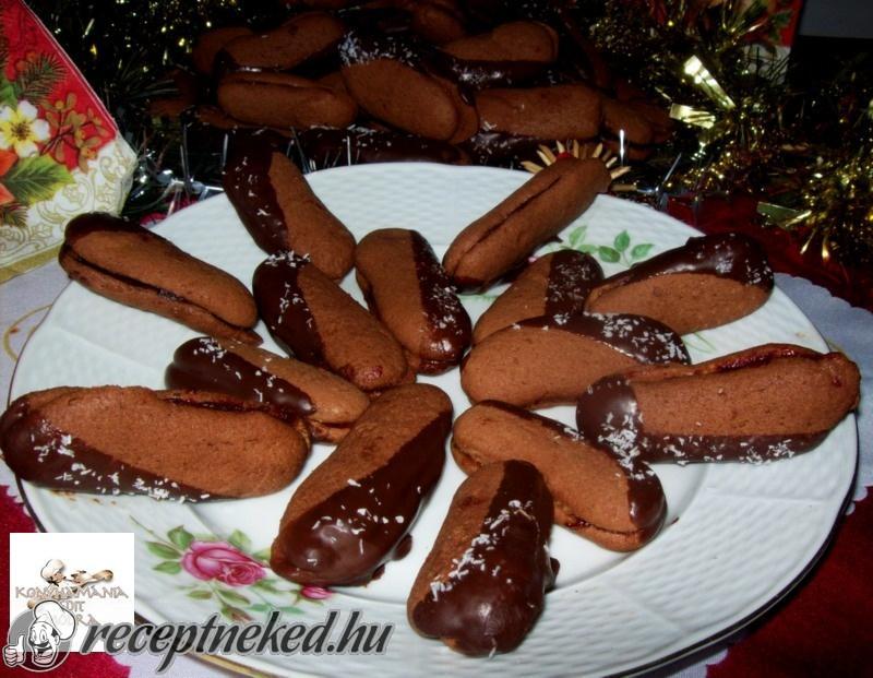 A vajat a porcukorral, kevés liszttel habosra keverjük, majd hozzáadjuk egyenként a tojásokat, a megmaradt lisztet és végül a kakaóport. Habzsákba töltjük a masszát és 5 cm-es rudakat nyomunk sütőpapírral fedett tepsire.