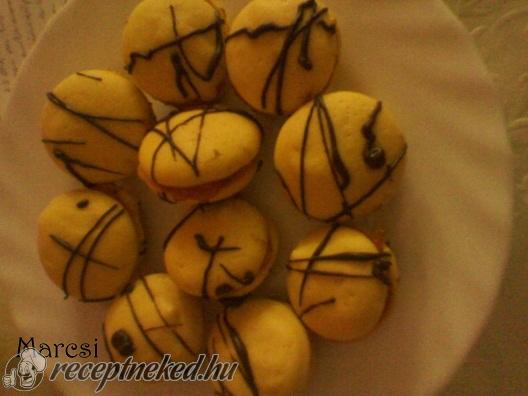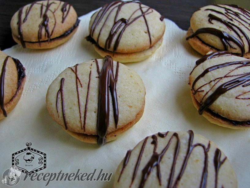 Amikor a korongok kihűltek, akkor 2-2-őt összeragasztunk lekvárral, majd az olajjal felolvasztott csokival csorgatjuk.