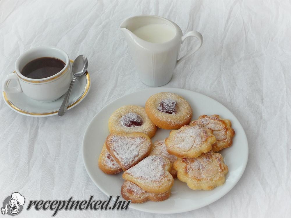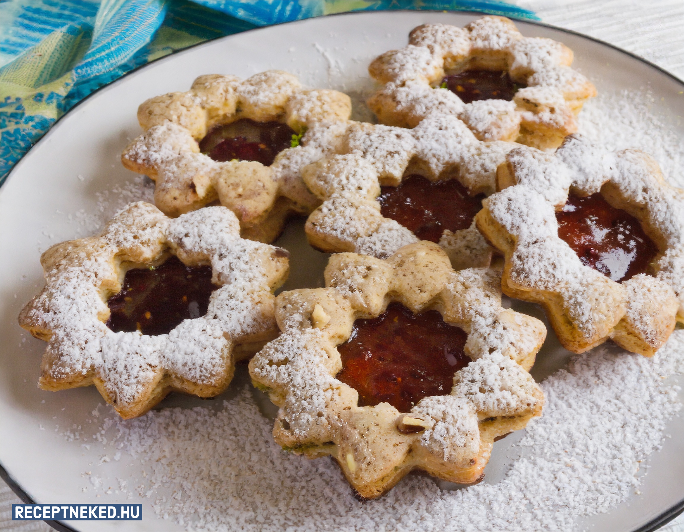 Mindegyik közepére teszünk ízlés szerint lekvárt, a lyukas süteményeket pedig meghintjük porcukorral, majd összeragasztjuk a másik, lekváros részével.