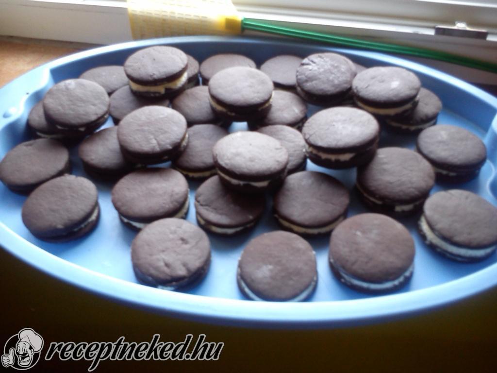 A krémet kivesszük a hűtőből, és a kihűlt keksz egyik felére 1 teáskanálnyi krémet teszünk, majd rátesszük a keksz másik felét, és addig nyomjuk össze, amíg a krém eléri a kekszek széleit.