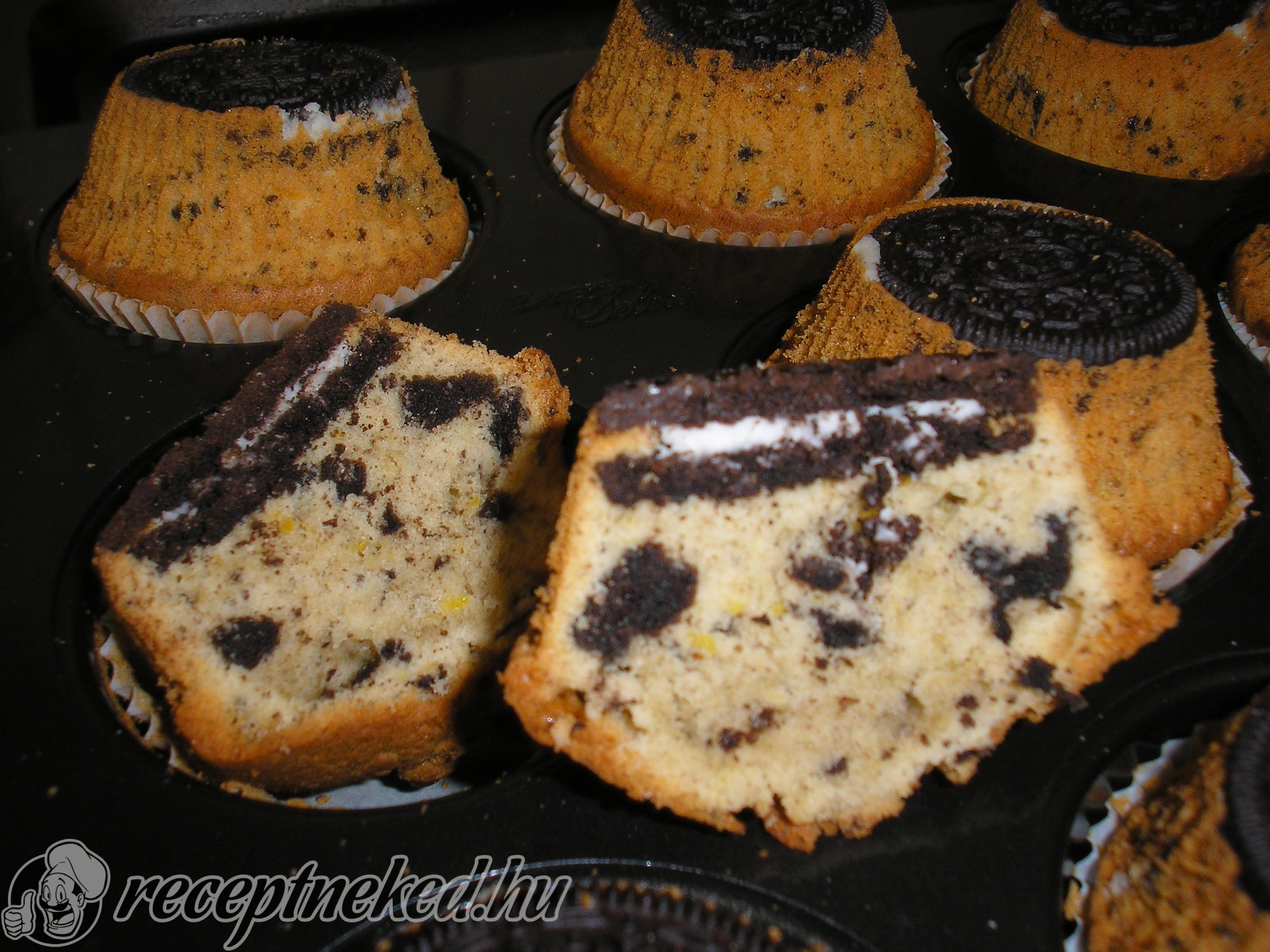 A muffin sütőbe kapszlikat rakunk. Előmelegítjük a sütőt 200 fokra. A formák alját az egész oreo kekszekkel kirakjuk, majd erre halmozzuk 3/4 részig a masszát. Pontosan 12 db-ra elég a tésztánk.