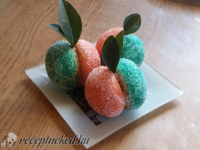 A krémmel megtöltjük a félgömböket, és összepárosítjuk. Mindegyik barackot megfestjük egy ecset segítségével aromával, és rögtön kristálycukorba forgatjuk.