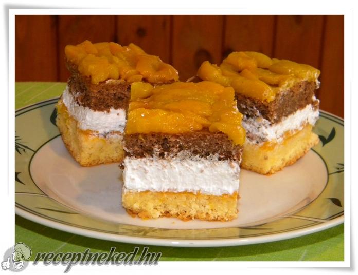 A sárga piskótalapot visszatesszük a tepsibe, tetejét kirakjuk vékony szeletekre vágott őszibarackkal. A habtejszínt kemény habbá verjük, hozzáadjuk a mascarponét, a mézet és a citromhéjat. A zselatint kevés forró vízben feloldjuk, majd a krémhez keverjük. A masszát a barackos tésztára simítjuk, végül rátesszük a kakaós piskótalapot, és enyhén rányomkodjuk. Hűtőben pihentetjük, amíg megdermed.