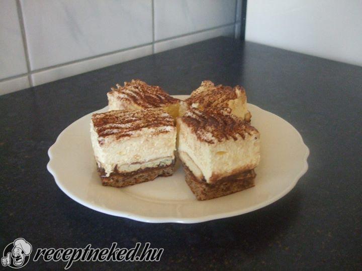 A piskótát átfordítjuk és a dióra rákenjük a mogyorókrémet, majd kirakjuk a kávéba mártott keksszel és rákenjük a tojásos krémet. Tetejét megszórjuk a kakaóporral. Egy éjszakára lehűtjük és másnap éles késsel szeleteljük.