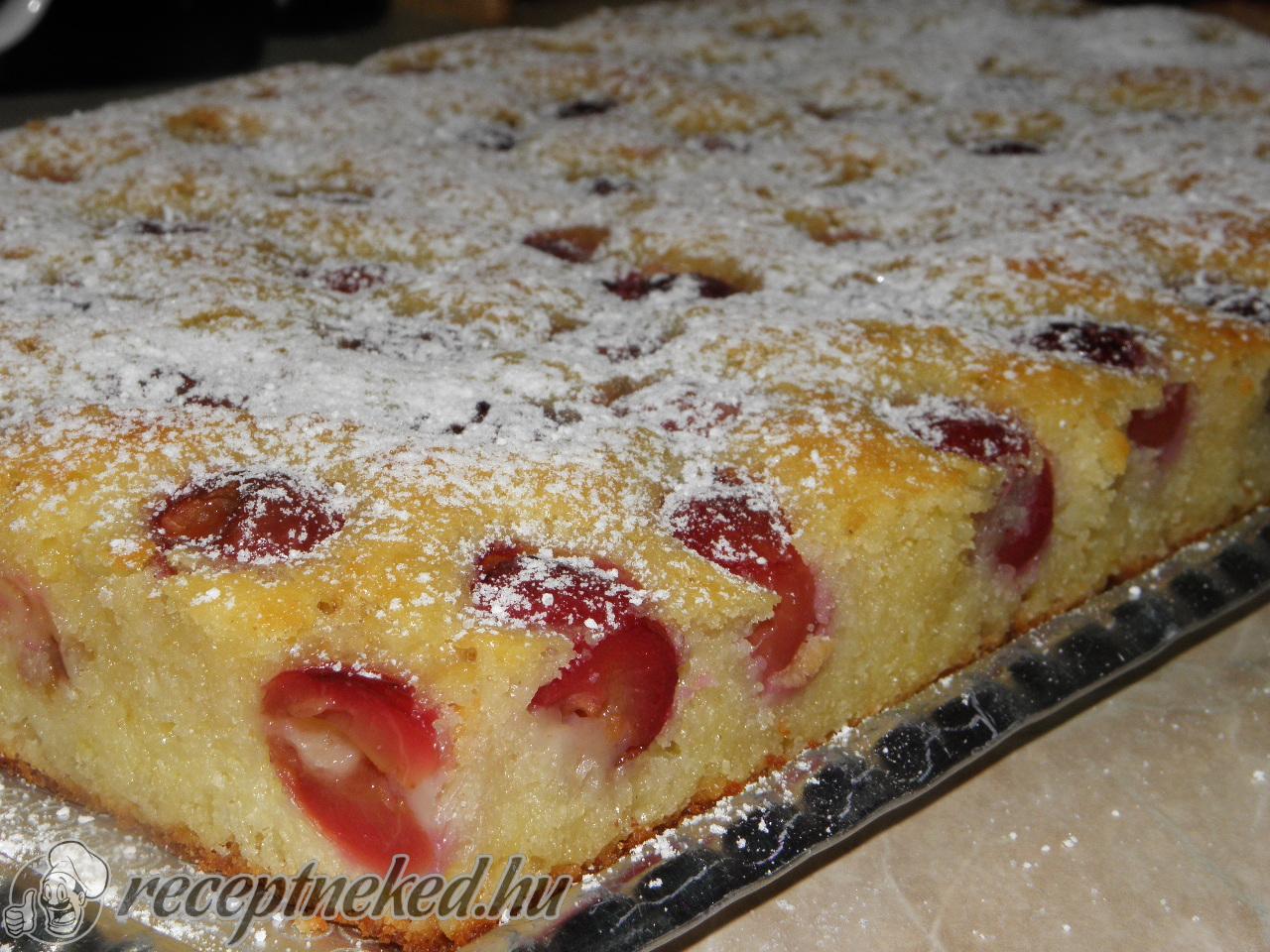 Egy 36*26 cm-es tepsit kibélelünk sütőpapírral, majd a masszát egyenletesen elterítjük benne. Megszórjuk magozott cseresznyével és előmelegített sütőben 180 fokon 25-30 perc alatt megsütjük.