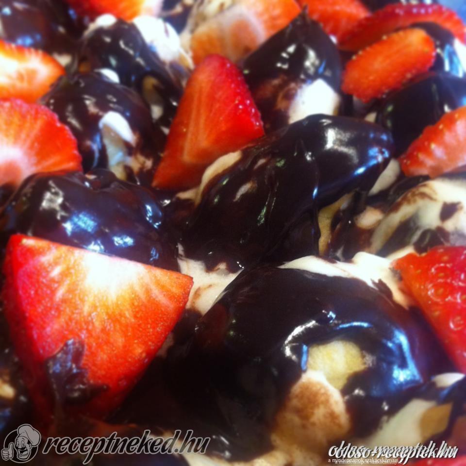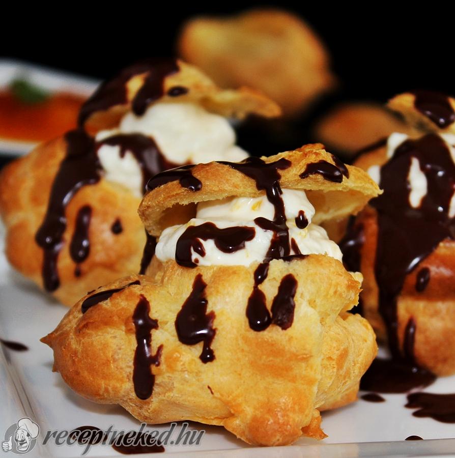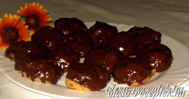 A csokimázhoz egy edényben folyamatos keverés mellett összeolvasztjuk a cukrot, kakaóport, vajat és a vizet. A tésztához a vizet a vajjal, csipet sóval felforraljuk. Ha felforrt, hozzáadjuk a lisztet és addig keverjük, amíg a tészta az edény falától elválik. Ekkor a tűzről levesszük, hagyjuk langyosra hűlni, majd hozzákeverjük egyenként az egész tojásokat. Jól kikeverjük a […]