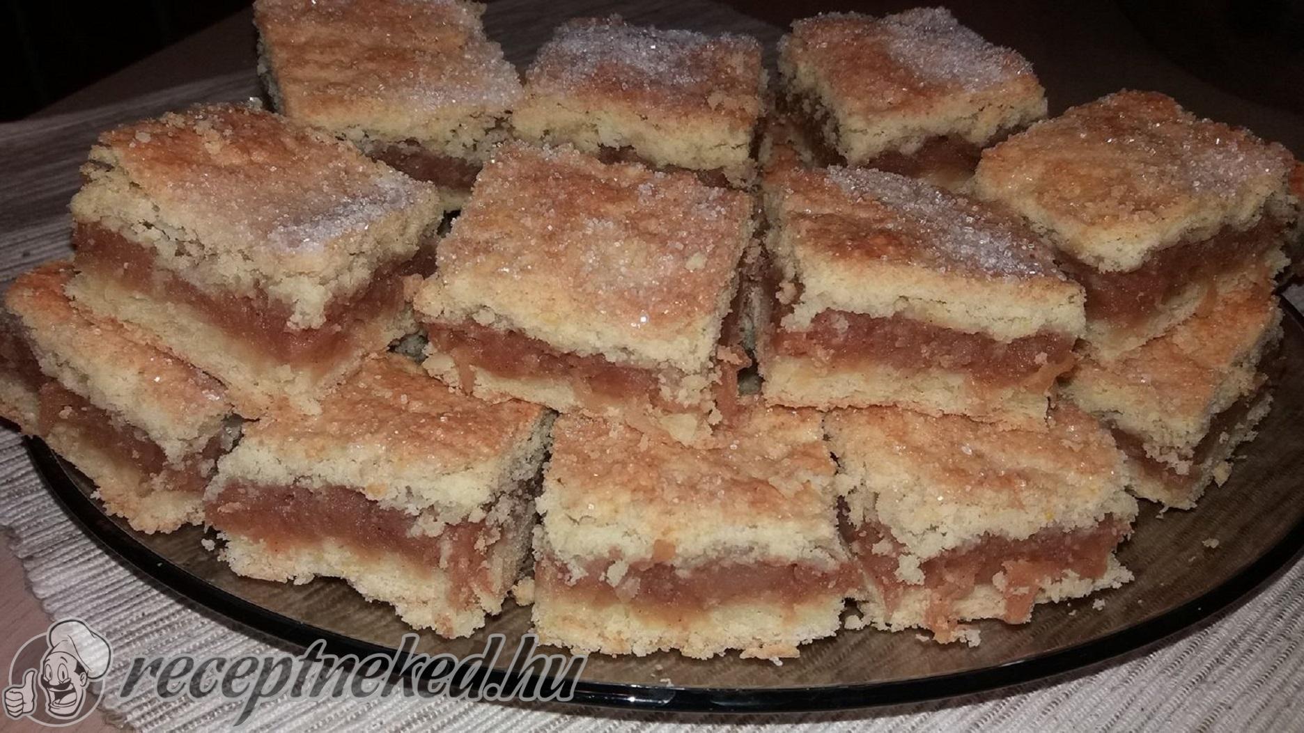 Ezután vegyük ki a fagyasztóból a tésztát, majd szintén egy nagyobb lyukú reszelőn reszeljük rá az almás töltelékre.