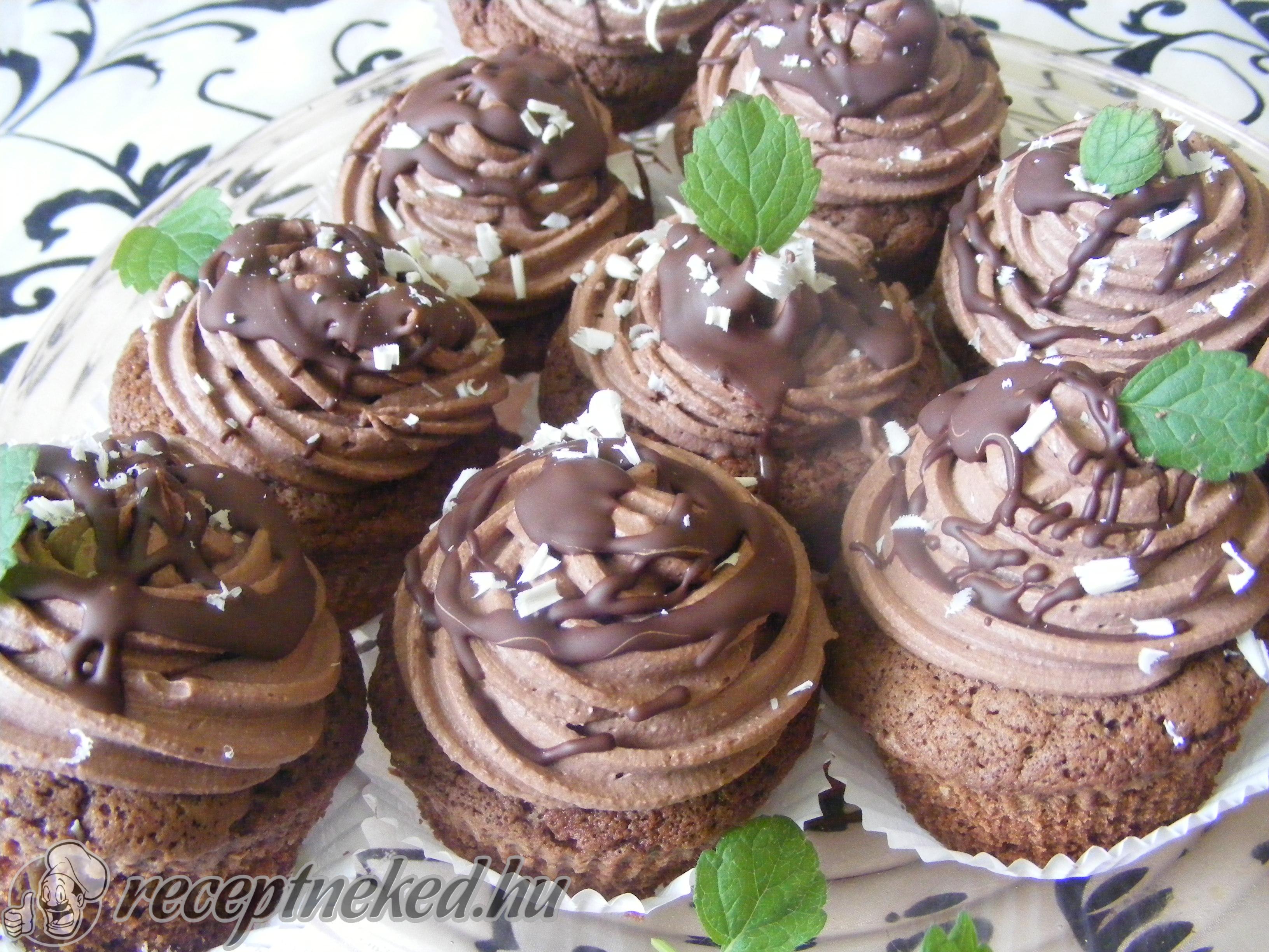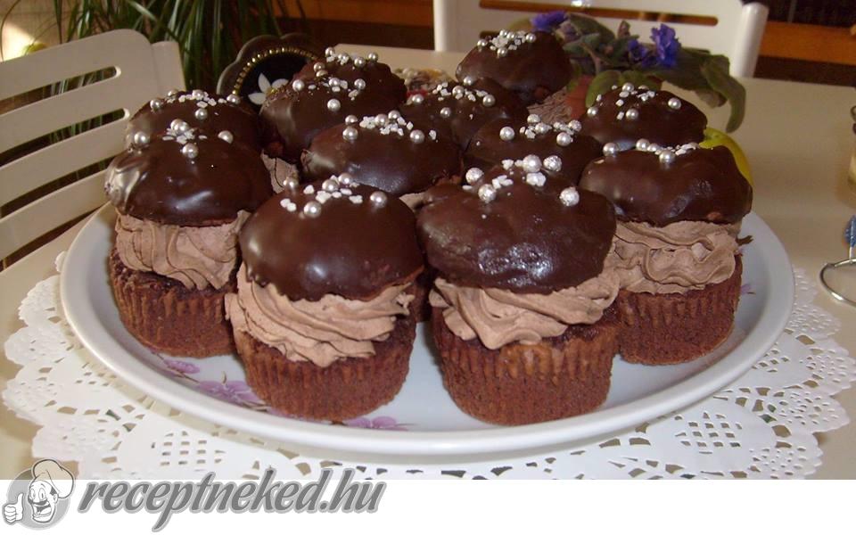 A krémhez a tejszínből kemény habot verünk. A csokoládét megolvasztjuk és a habbal homogénre keverjük. A krémet csillagcsővel ellátott habzsákba töltjük és megtöltjük a muffinokat.