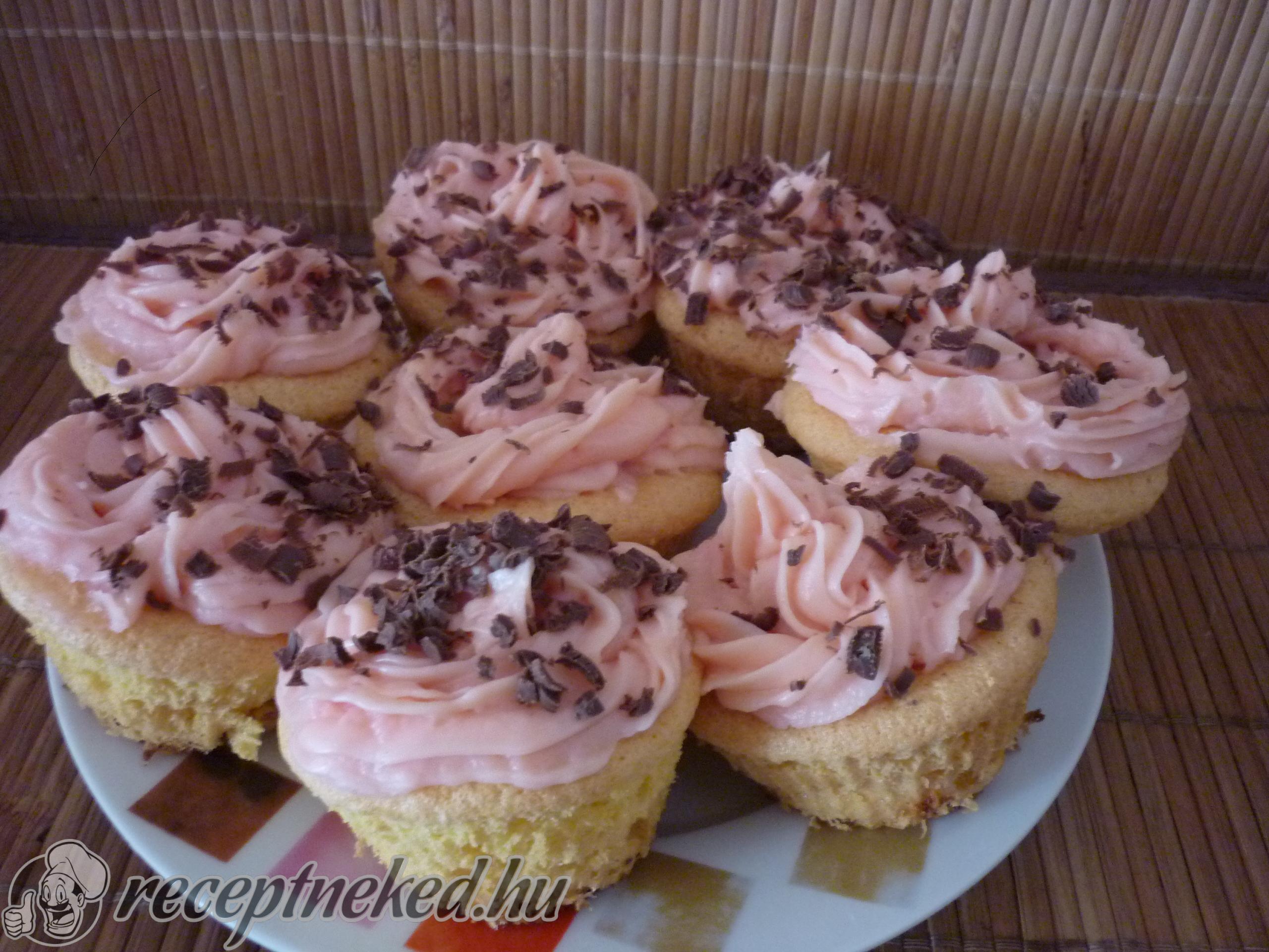 A kisült muffinokat kihűtjük, majd a pudingos krémet habzsákba töltjük és a sütemények tetejére rózsához hasonló formát nyomunk.
