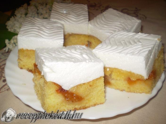 Közben a fehérjéket a cukorral nagyon kemény habbá verjük. Amikor a tészta megsült a habot rásimítjuk a tetejére, majd visszatoljuk a sütit 100-120 fokra kb 15 percre. A lényeg, hogy a hab ne legyen sárgás, különben a vágásnál a hab törni fog.