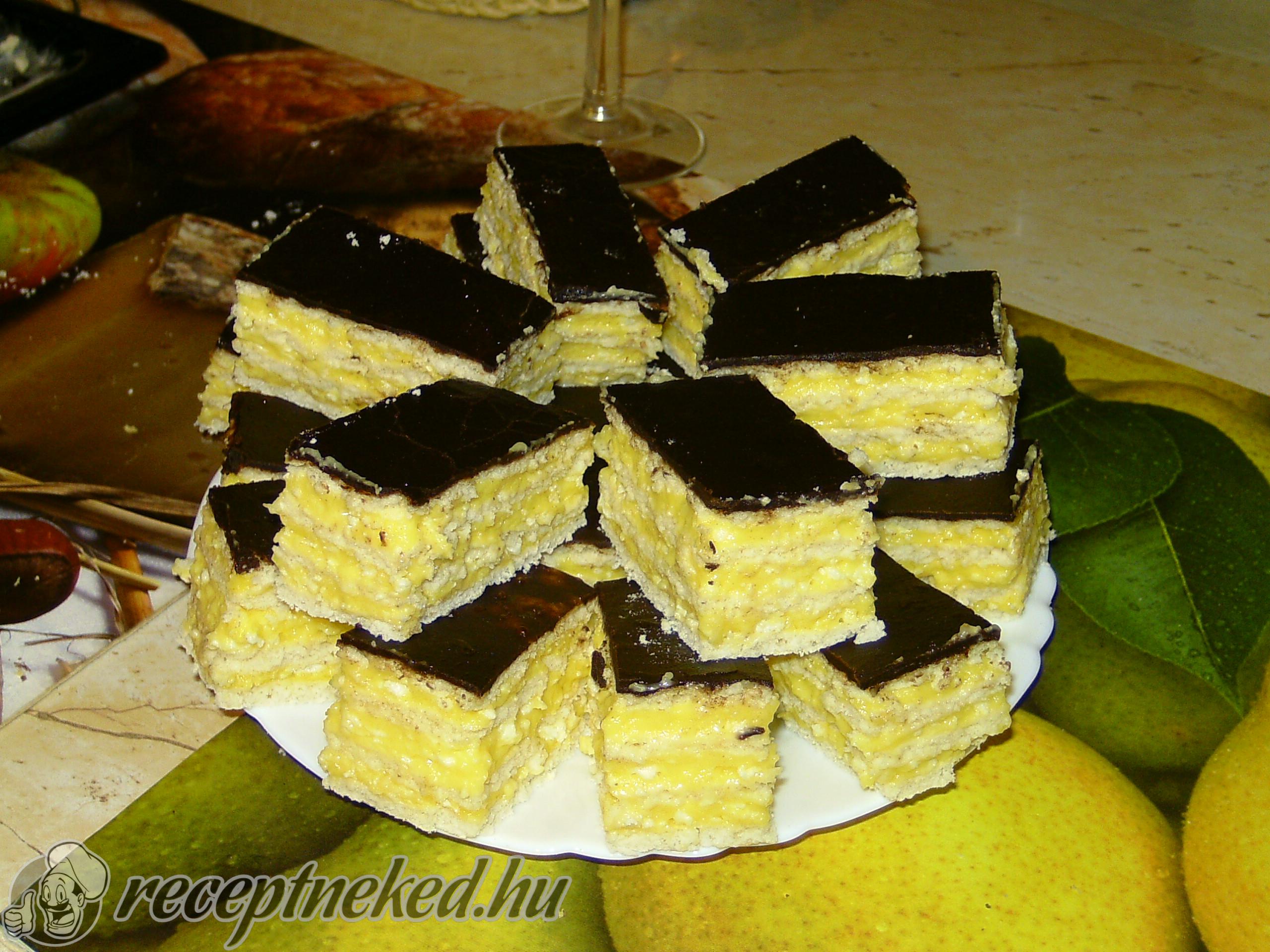 Ezzel bevonjuk a süti tetejét, majd hűtőbe tesszük. Másnapra megpuhulnak a lapok és forró vizes késsel szépen lehet szelni.