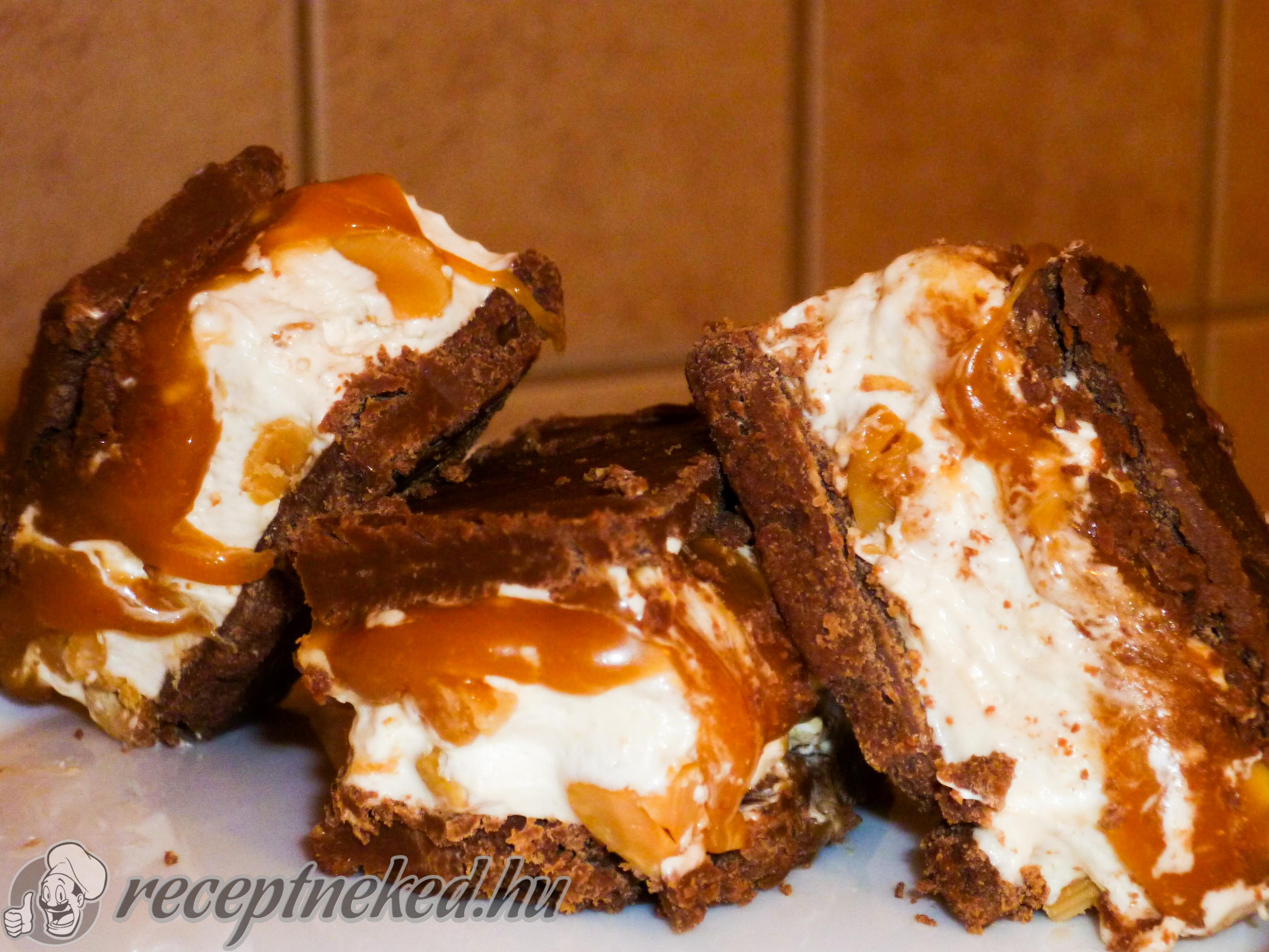 Olvasszuk meg a maradék tejcsokoládét, vajkaramellát, mogyoróvajat és kenjük a krémre, majd tegyük a hűtőbe, amíg megszilárdul.
