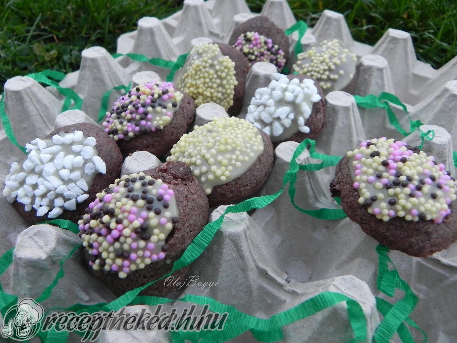 Sütőpapírral fedett tepsibe sorakoztatva, előmelegített 180 fokos sütőben 8-10 perc alatt kisütjük.  Hűtőrácsra tesszük és vízgőzön megolvasztott csokoládéba mártjuk a “tojás”keksz tetejét, színes szórócukorba mártjuk és dermesztjük.