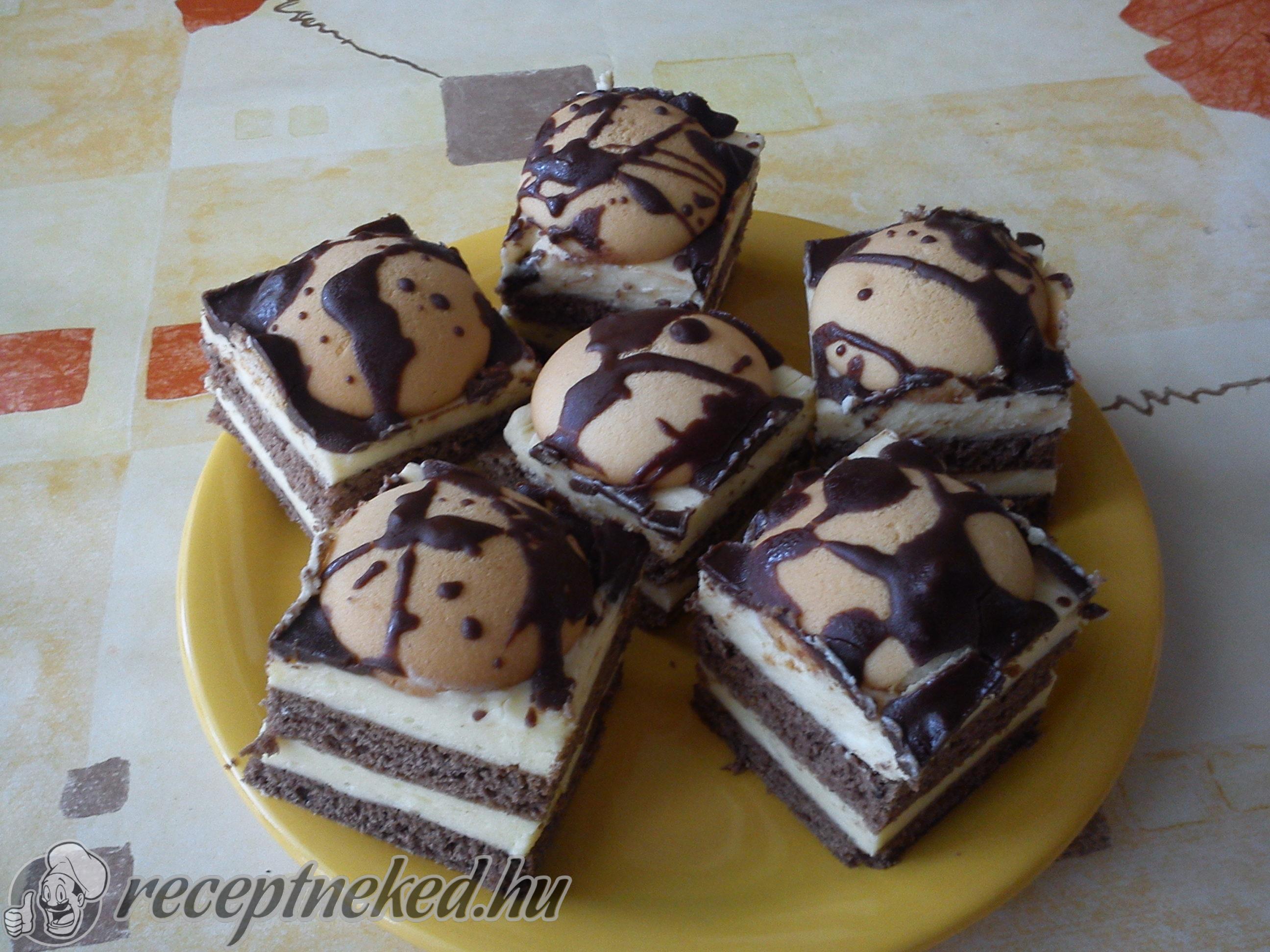 Az egyik tésztalapra rákenjük a krém felét, majd ráhelyezzük a második lapot. A tetejére a maradék krémet simítjuk, és sorban elhelyezzük rajta a piskótatallérokat. Az étcsokoládét gőz fölött felolvasztjuk, és a tallérok tetejére csorgatjuk.