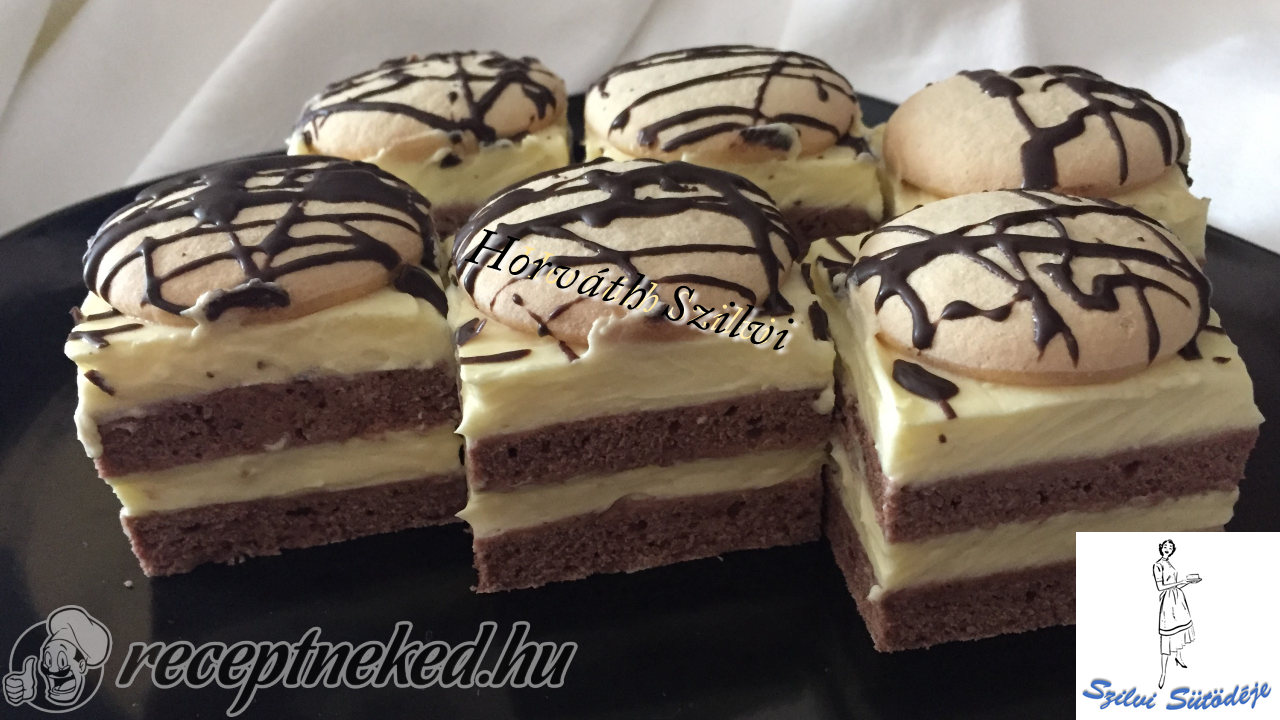 Az egyik kakaós lapot tálcára helyezzük, rákenjük a krém felét, majd befedjük a másik lappal. A maradék krémet a sütemény tetejére simítjuk és sorban kirakjuk piskótatallérral.