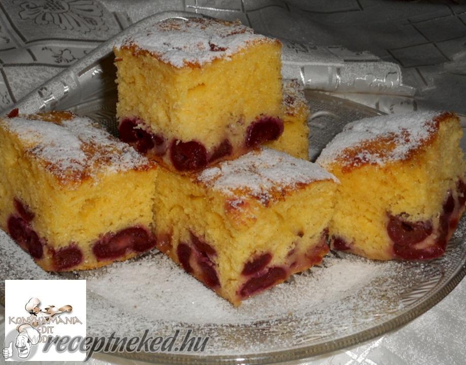 Összekeverjük, majd egy sütőpapírral bélelt 20×30 cm-es tepsibe simítjuk és a tetejét kirakjuk cseresznyével.