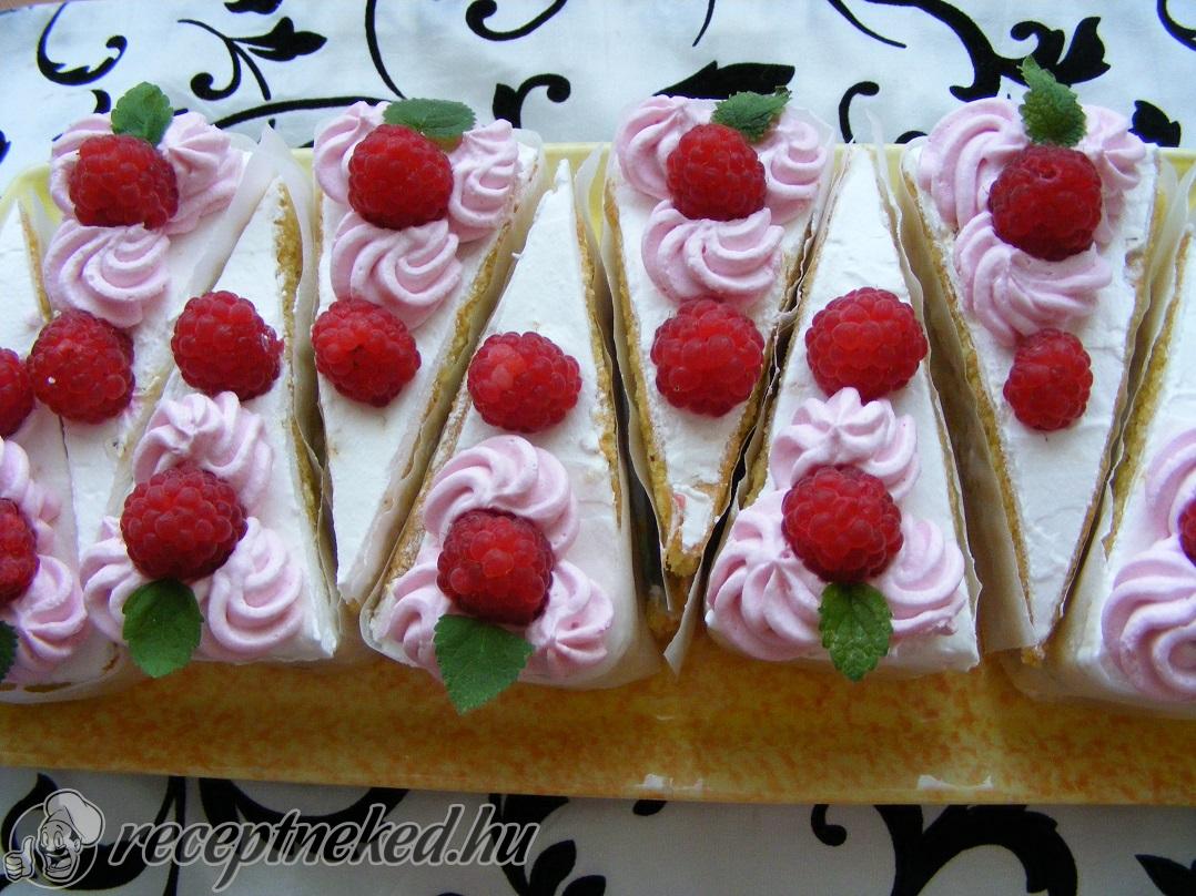 A cukros lapokat megtöltjük a krémmel, egymásra tesszük, majd a tetejére kerül az utolsó lap. Tejszínnel bevontam a süteményt, majd díszítés gyanánt a maradék habtejszínbe málnaszörpöt kevertem és ezzel díszítettem a sütemény tetejét.